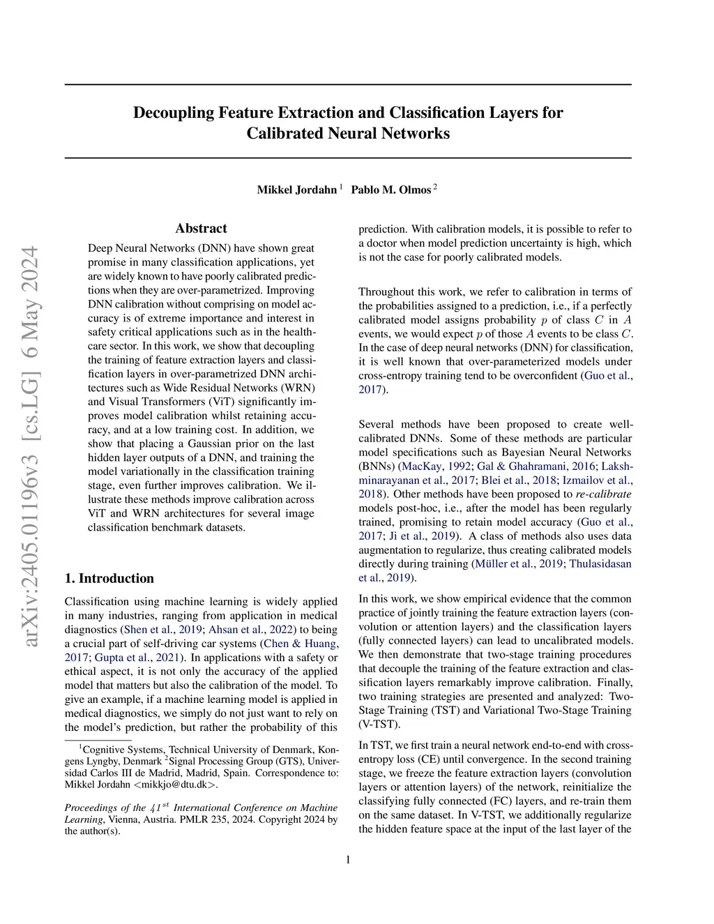 Deep Neural Networks (DNN) have shown great promise in many classification applications, yet are widely known to have poorly calibrated predictions when they are over-parametrized. Improving DNN calibration without comprising on model accuracy is of extreme importance and interest in safety critical applications such as in the health-care sector. In this work, we show that decoupling the training of feature extraction layers and classification layers in over-parametrized DNN architectures such as Wide Residual Networks (WRN) and Visual Transformers (ViT) significantly improves model calibration whilst retaining accuracy, and at a low training cost. In addition, we show that placing a Gaussian prior on the last hidden layer outputs of a DNN, and training the model variationally in the classification training stage, even further improves calibration. We illustrate these methods improve calibration across ViT and WRN architectures for several image classification benchmark datasets.
