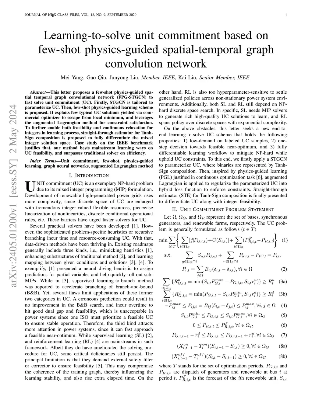 This letter proposes a few-shot physics-guided spatial temporal graph convolutional network (FPG-STGCN) to fast solve unit commitment (UC). Firstly, STGCN is tailored to parameterize UC. Then, few-shot physics-guided learning scheme is proposed. It exploits few typical UC solutions yielded via commercial optimizer to escape from local minimum, and leverages the augmented Lagrangian method for constraint satisfaction. To further enable both feasibility and continuous relaxation for integers in learning process, straight-through estimator for Tanh-Sign composition is proposed to fully differentiate the mixed integer solution space. Case study on the IEEE benchmark justifies that, our method bests mainstream learning ways on UC feasibility, and surpasses traditional solver on efficiency.