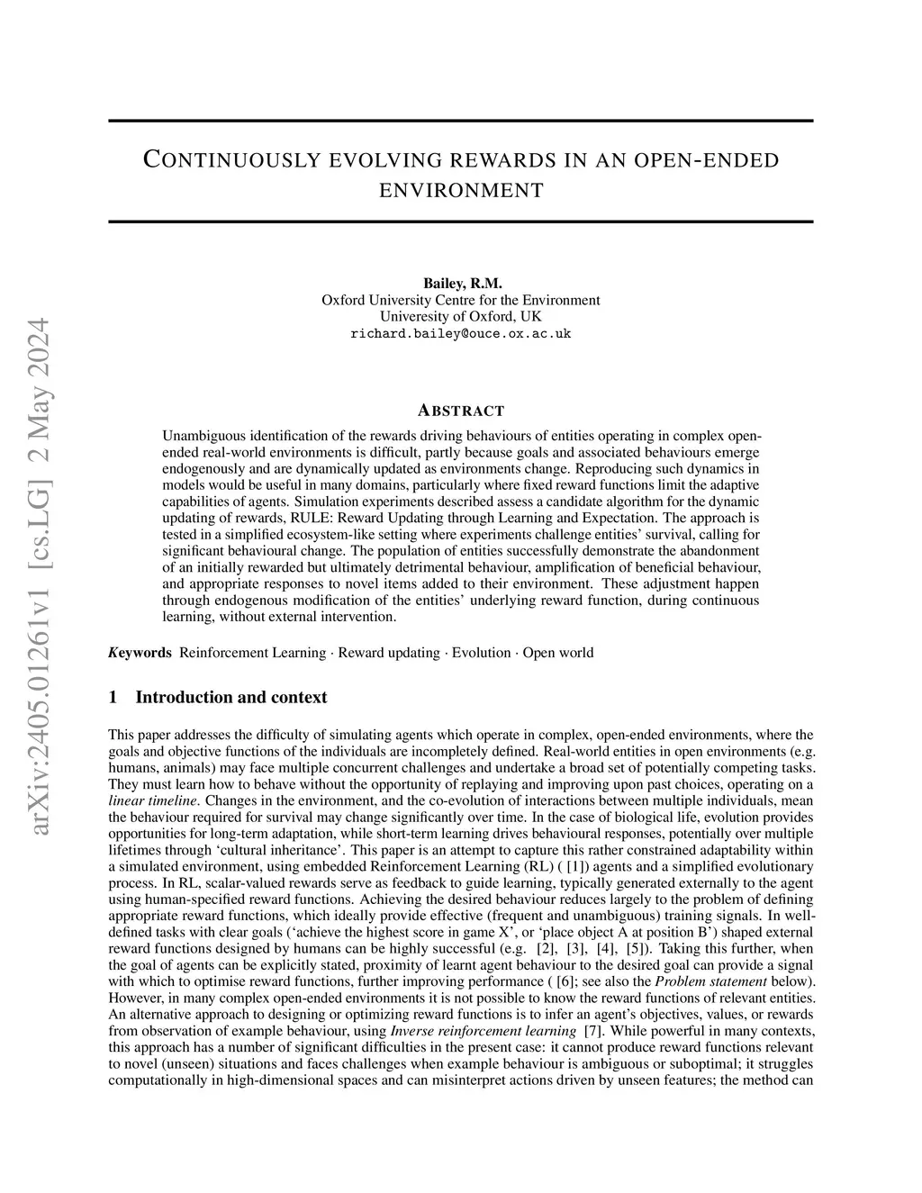 Unambiguous identification of the rewards driving behaviours of entities operating in complex open-ended real-world environments is difficult, partly because goals and associated behaviours emerge endogenously and are dynamically updated as environments change. Reproducing such dynamics in models would be useful in many domains, particularly where fixed reward functions limit the adaptive capabilities of agents. Simulation experiments described assess a candidate algorithm for the dynamic updating of rewards, RULE: Reward Updating through Learning and Expectation. The approach is tested in a simplified ecosystem-like setting where experiments challenge entities' survival, calling for significant behavioural change. The population of entities successfully demonstrate the abandonment of an initially rewarded but ultimately detrimental behaviour, amplification of beneficial behaviour, and appropriate responses to novel items added to their environment. These adjustment happen through endogenous modification of the entities' underlying reward function, during continuous learning, without external intervention.