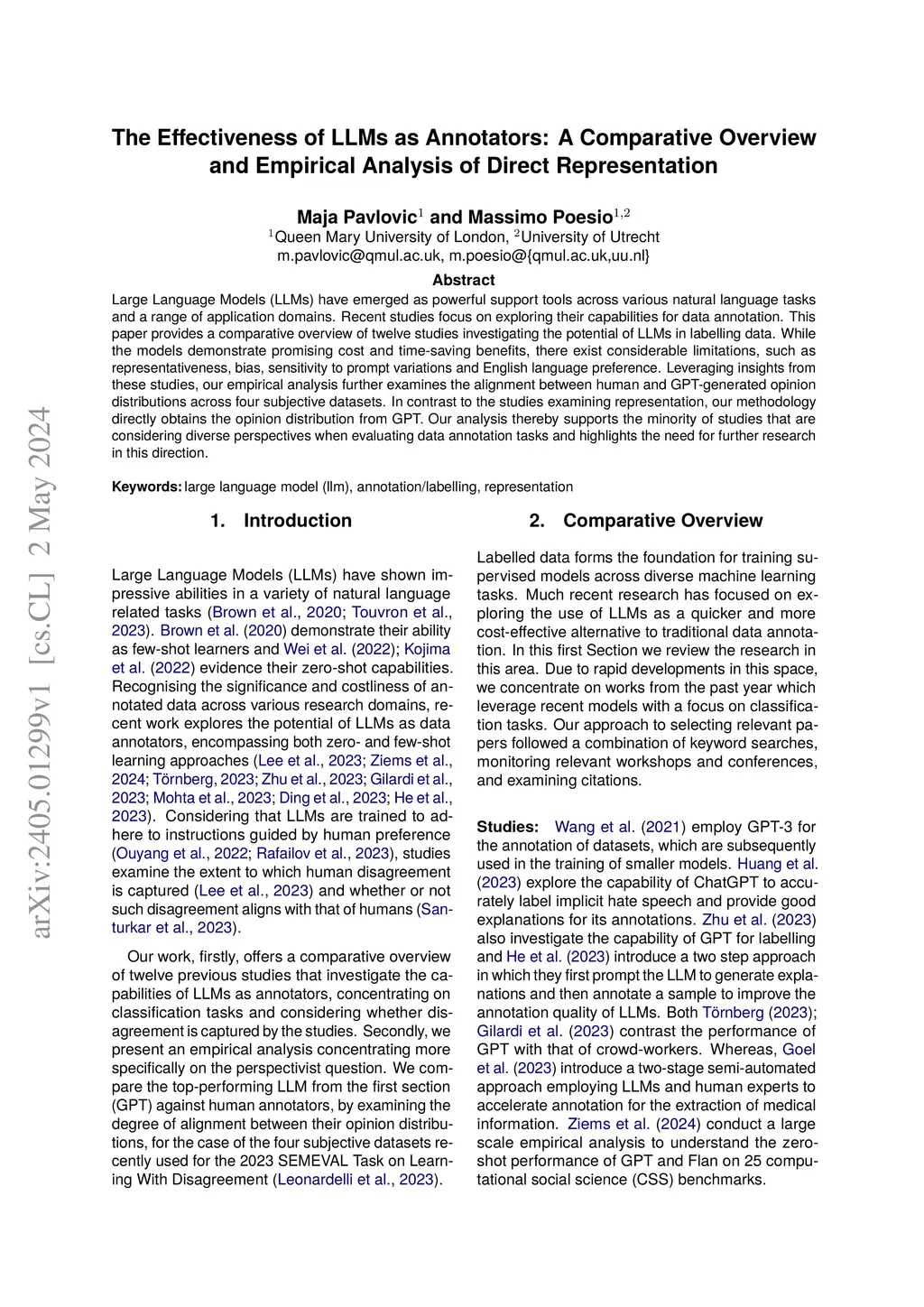 Large Language Models (LLMs) have emerged as powerful support tools across various natural language tasks and a range of application domains. Recent studies focus on exploring their capabilities for data annotation. This paper provides a comparative overview of twelve studies investigating the potential of LLMs in labelling data. While the models demonstrate promising cost and time-saving benefits, there exist considerable limitations, such as representativeness, bias, sensitivity to prompt variations and English language preference. Leveraging insights from these studies, our empirical analysis further examines the alignment between human and GPT-generated opinion distributions across four subjective datasets. In contrast to the studies examining representation, our methodology directly obtains the opinion distribution from GPT. Our analysis thereby supports the minority of studies that are considering diverse perspectives when evaluating data annotation tasks and highlights the need for further research in this direction.