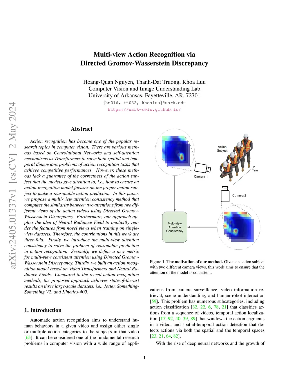 Action recognition has become one of the popular research topics in computer vision. There are various methods based on Convolutional Networks and self-attention mechanisms as Transformers to solve both spatial and temporal dimensions problems of action recognition tasks that achieve competitive performances. However, these methods lack a guarantee of the correctness of the action subject that the models give attention to, i.e., how to ensure an action recognition model focuses on the proper action subject to make a reasonable action prediction. In this paper, we propose a multi-view attention consistency method that computes the similarity between two attentions from two different views of the action videos using Directed Gromov-Wasserstein Discrepancy. Furthermore, our approach applies the idea of Neural Radiance Field to implicitly render the features from novel views when training on single-view datasets. Therefore, the contributions in this work are three-fold. Firstly, we introduce the multi-view attention consistency to solve the problem of reasonable prediction in action recognition. Secondly, we define a new metric for multi-view consistent attention using Directed Gromov-Wasserstein Discrepancy. Thirdly, we built an action recognition model based on Video Transformers and Neural Radiance Fields. Compared to the recent action recognition methods, the proposed approach achieves state-of-the-art results on three large-scale datasets, i.e., Jester, Something-Something V2, and Kinetics-400.