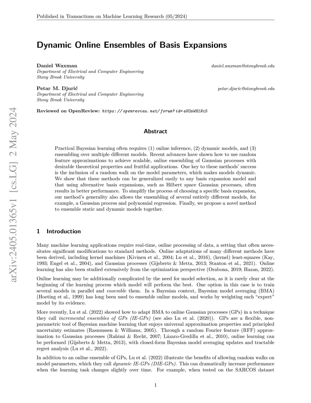 Practical Bayesian learning often requires (1) online inference, (2) dynamic models, and (3) ensembling over multiple different models. Recent advances have shown how to use random feature approximations to achieve scalable, online ensembling of Gaussian processes with desirable theoretical properties and fruitful applications. One key to these methods' success is the inclusion of a random walk on the model parameters, which makes models dynamic. We show that these methods can be generalized easily to any basis expansion model and that using alternative basis expansions, such as Hilbert space Gaussian processes, often results in better performance. To simplify the process of choosing a specific basis expansion, our method's generality also allows the ensembling of several entirely different models, for example, a Gaussian process and polynomial regression. Finally, we propose a novel method to ensemble static and dynamic models together.