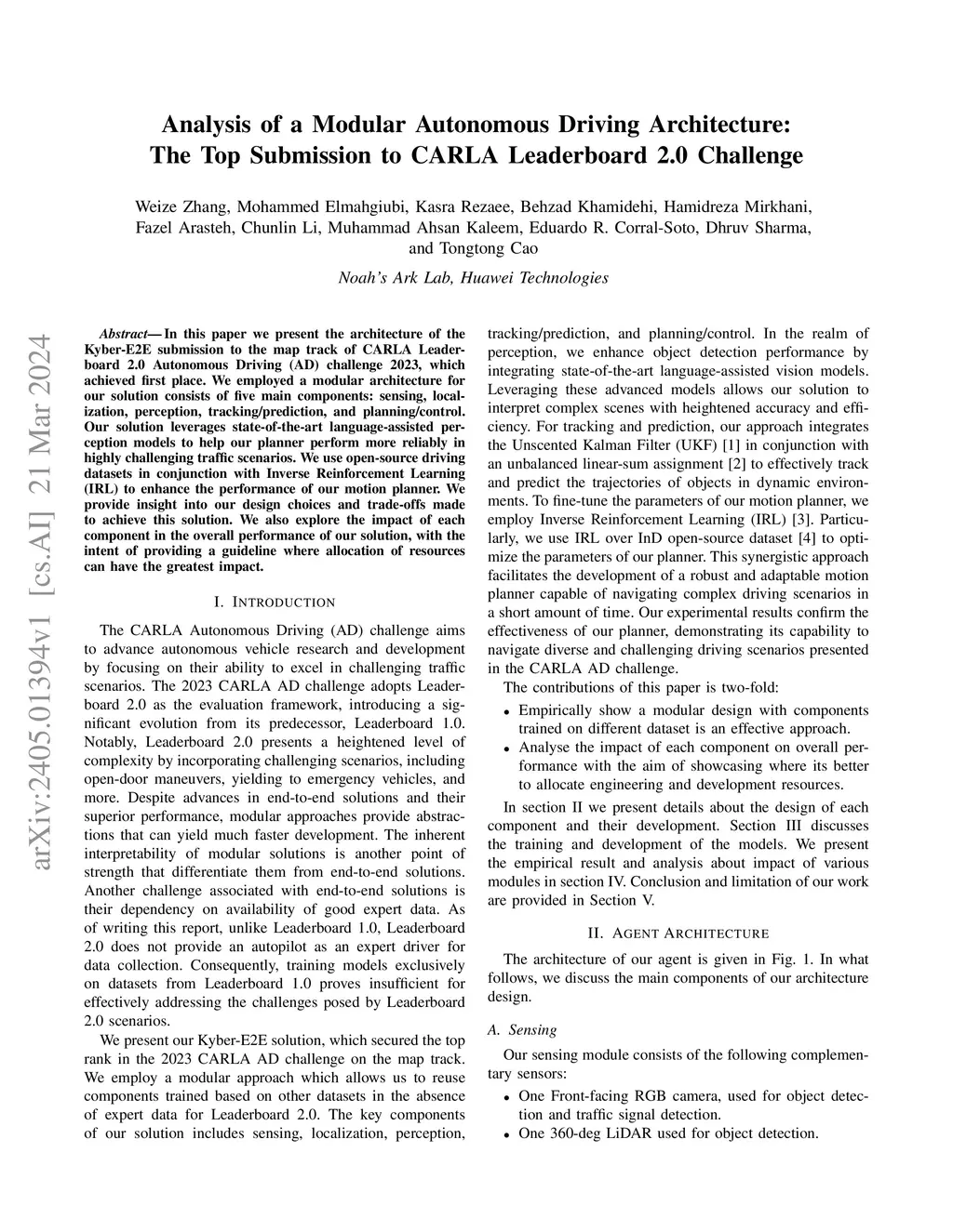 In this paper we present the architecture of the Kyber-E2E submission to the map track of CARLA Leaderboard 2.0 Autonomous Driving (AD) challenge 2023, which achieved first place. We employed a modular architecture for our solution consists of five main components: sensing, localization, perception, tracking/prediction, and planning/control. Our solution leverages state-of-the-art language-assisted perception models to help our planner perform more reliably in highly challenging traffic scenarios. We use open-source driving datasets in conjunction with Inverse Reinforcement Learning (IRL) to enhance the performance of our motion planner. We provide insight into our design choices and trade-offs made to achieve this solution. We also explore the impact of each component in the overall performance of our solution, with the intent of providing a guideline where allocation of resources can have the greatest impact.