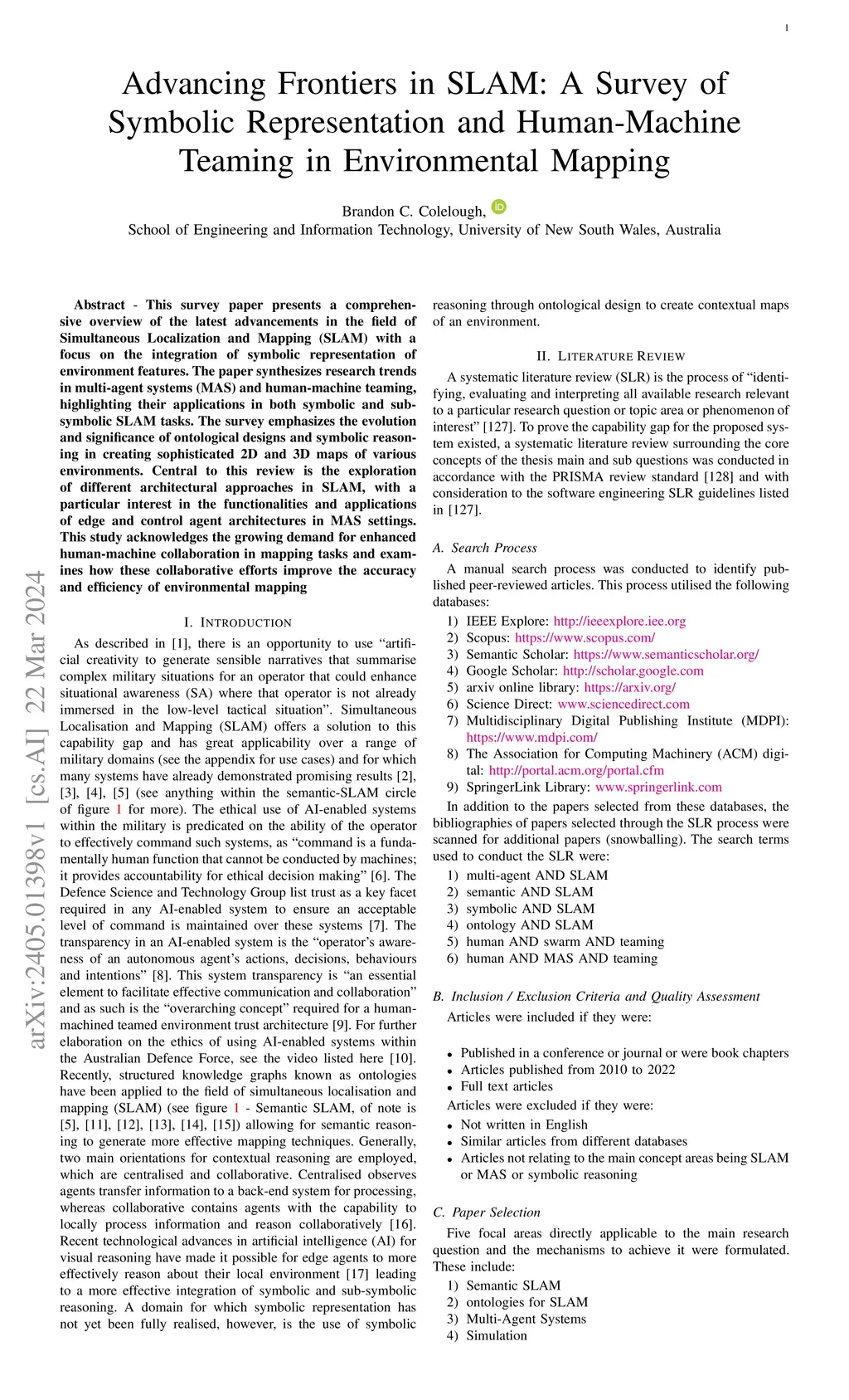 This survey paper presents a comprehensive overview of the latest advancements in the field of Simultaneous Localization and Mapping (SLAM) with a focus on the integration of symbolic representation of environment features. The paper synthesizes research trends in multi-agent systems (MAS) and human-machine teaming, highlighting their applications in both symbolic and sub-symbolic SLAM tasks. The survey emphasizes the evolution and significance of ontological designs and symbolic reasoning in creating sophisticated 2D and 3D maps of various environments. Central to this review is the exploration of different architectural approaches in SLAM, with a particular interest in the functionalities and applications of edge and control agent architectures in MAS settings. This study acknowledges the growing demand for enhanced human-machine collaboration in mapping tasks and examines how these collaborative efforts improve the accuracy and efficiency of environmental mapping