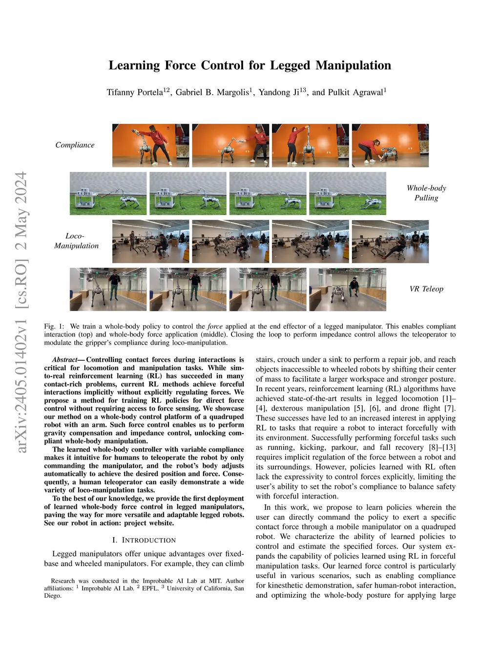 Controlling contact forces during interactions is critical for locomotion and manipulation tasks. While sim-to-real reinforcement learning (RL) has succeeded in many contact-rich problems, current RL methods achieve forceful interactions implicitly without explicitly regulating forces. We propose a method for training RL policies for direct force control without requiring access to force sensing. We showcase our method on a whole-body control platform of a quadruped robot with an arm. Such force control enables us to perform gravity compensation and impedance control, unlocking compliant whole-body manipulation. The learned whole-body controller with variable compliance makes it intuitive for humans to teleoperate the robot by only commanding the manipulator, and the robot's body adjusts automatically to achieve the desired position and force. Consequently, a human teleoperator can easily demonstrate a wide variety of loco-manipulation tasks. To the best of our knowledge, we provide the first deployment of learned whole-body force control in legged manipulators, paving the way for more versatile and adaptable legged robots.