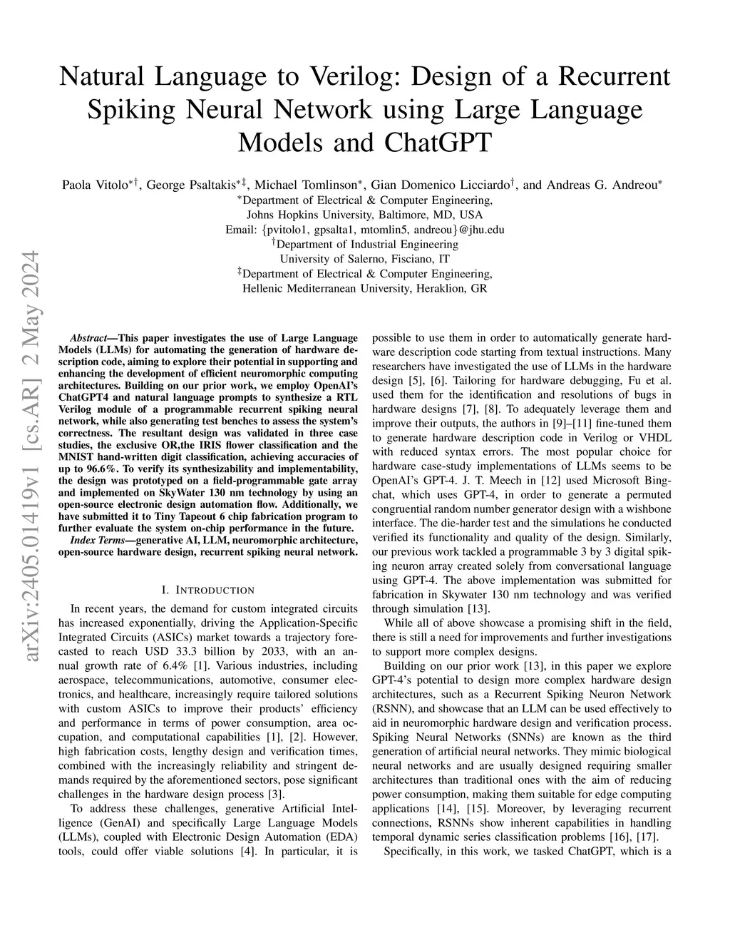 This paper investigates the use of Large Language Models (LLMs) for automating the generation of hardware description code, aiming to explore their potential in supporting and enhancing the development of efficient neuromorphic computing architectures. Building on our prior work, we employ OpenAI's ChatGPT4 and natural language prompts to synthesize a RTL Verilog module of a programmable recurrent spiking neural network, while also generating test benches to assess the system's correctness. The resultant design was validated in three case studies, the exclusive OR,the IRIS flower classification and the MNIST hand-written digit classification, achieving accuracies of up to 96.6%. To verify its synthesizability and implementability, the design was prototyped on a field-programmable gate array and implemented on SkyWater 130 nm technology by using an open-source electronic design automation flow. Additionally, we have submitted it to Tiny Tapeout 6 chip fabrication program to further evaluate the system on-chip performance in the future.
