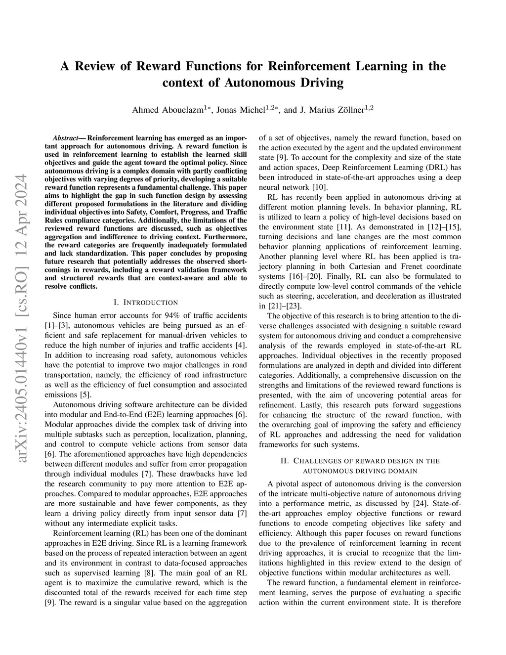 A Review of Reward Functions for Reinforcement Learning in the context of Autonomous Driving