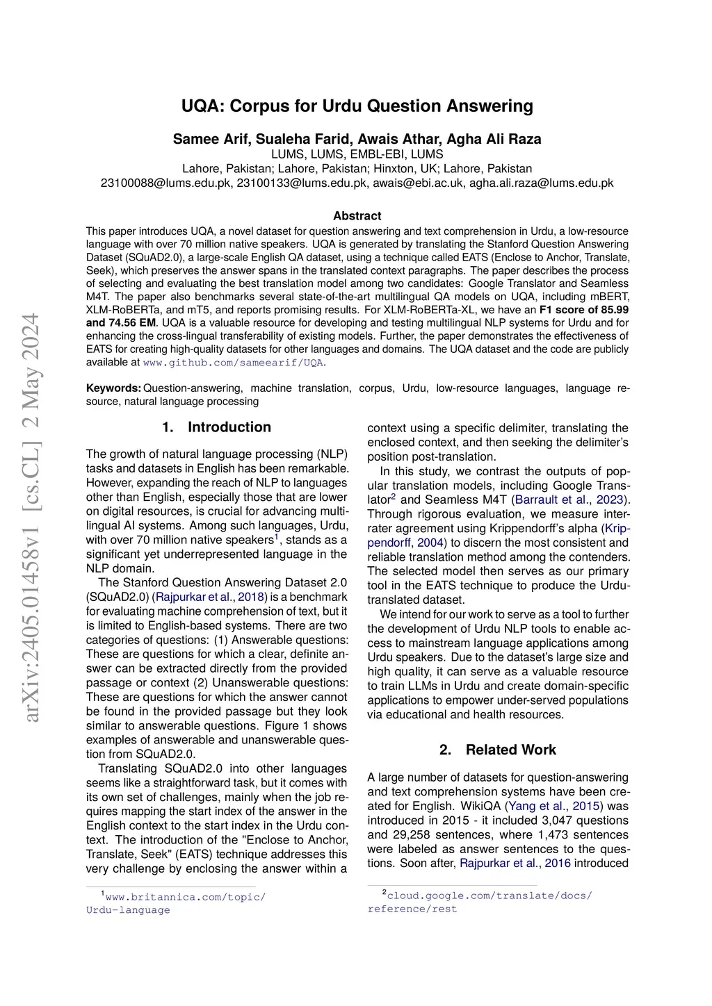This paper introduces UQA, a novel dataset for question answering and text comprehension in Urdu, a low-resource language with over 70 million native speakers. UQA is generated by translating the Stanford Question Answering Dataset (SQuAD2.0), a large-scale English QA dataset, using a technique called EATS (Enclose to Anchor, Translate, Seek), which preserves the answer spans in the translated context paragraphs. The paper describes the process of selecting and evaluating the best translation model among two candidates: Google Translator and Seamless M4T. The paper also benchmarks several state-of-the-art multilingual QA models on UQA, including mBERT, XLM-RoBERTa, and mT5, and reports promising results. For XLM-RoBERTa-XL, we have an F1 score of 85.99 and 74.56 EM. UQA is a valuable resource for developing and testing multilingual NLP systems for Urdu and for enhancing the cross-lingual transferability of existing models. Further, the paper demonstrates the effectiveness of EATS for creating high-quality datasets for other languages and domains. The UQA dataset and the code are publicly available at www.github.com/sameearif/UQA.