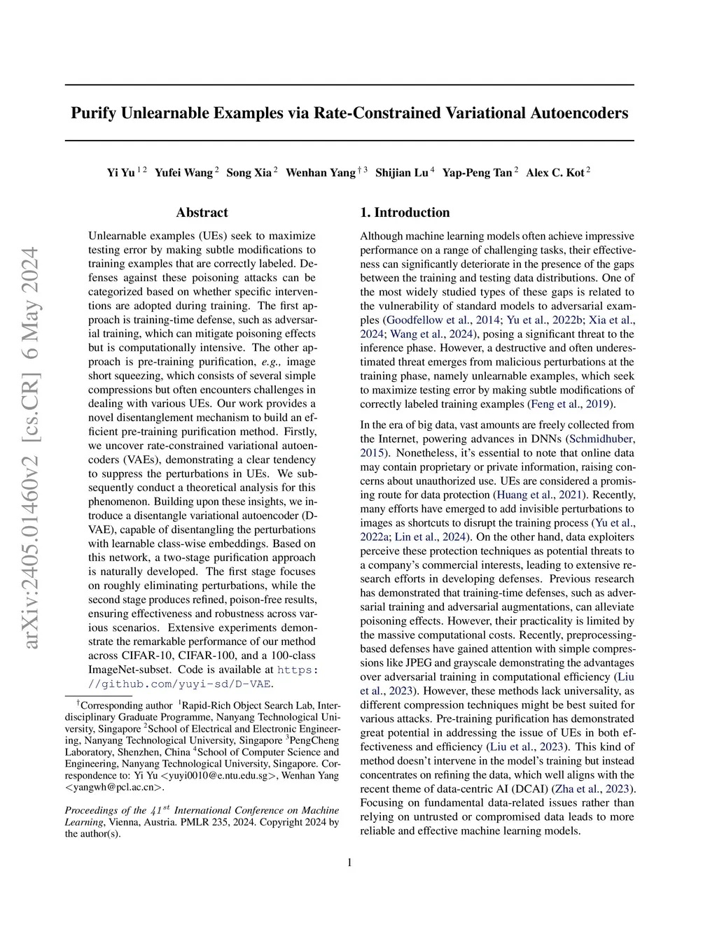 Unlearnable examples (UEs) seek to maximize testing error by making subtle modifications to training examples that are correctly labeled. Defenses against these poisoning attacks can be categorized based on whether specific interventions are adopted during training. The first approach is training-time defense, such as adversarial training, which can mitigate poisoning effects but is computationally intensive. The other approach is pre-training purification, e.g., image short squeezing, which consists of several simple compressions but often encounters challenges in dealing with various UEs. Our work provides a novel disentanglement mechanism to build an efficient pre-training purification method. Firstly, we uncover rate-constrained variational autoencoders (VAEs), demonstrating a clear tendency to suppress the perturbations in UEs. We subsequently conduct a theoretical analysis for this phenomenon. Building upon these insights, we introduce a disentangle variational autoencoder (D-VAE), capable of disentangling the perturbations with learnable class-wise embeddings. Based on this network, a two-stage purification approach is naturally developed. The first stage focuses on roughly eliminating perturbations, while the second stage produces refined, poison-free results, ensuring effectiveness and robustness across various scenarios. Extensive experiments demonstrate the remarkable performance of our method across CIFAR-10, CIFAR-100, and a 100-class ImageNet-subset. Code is available at https://github.com/yuyi-sd/D-VAE.