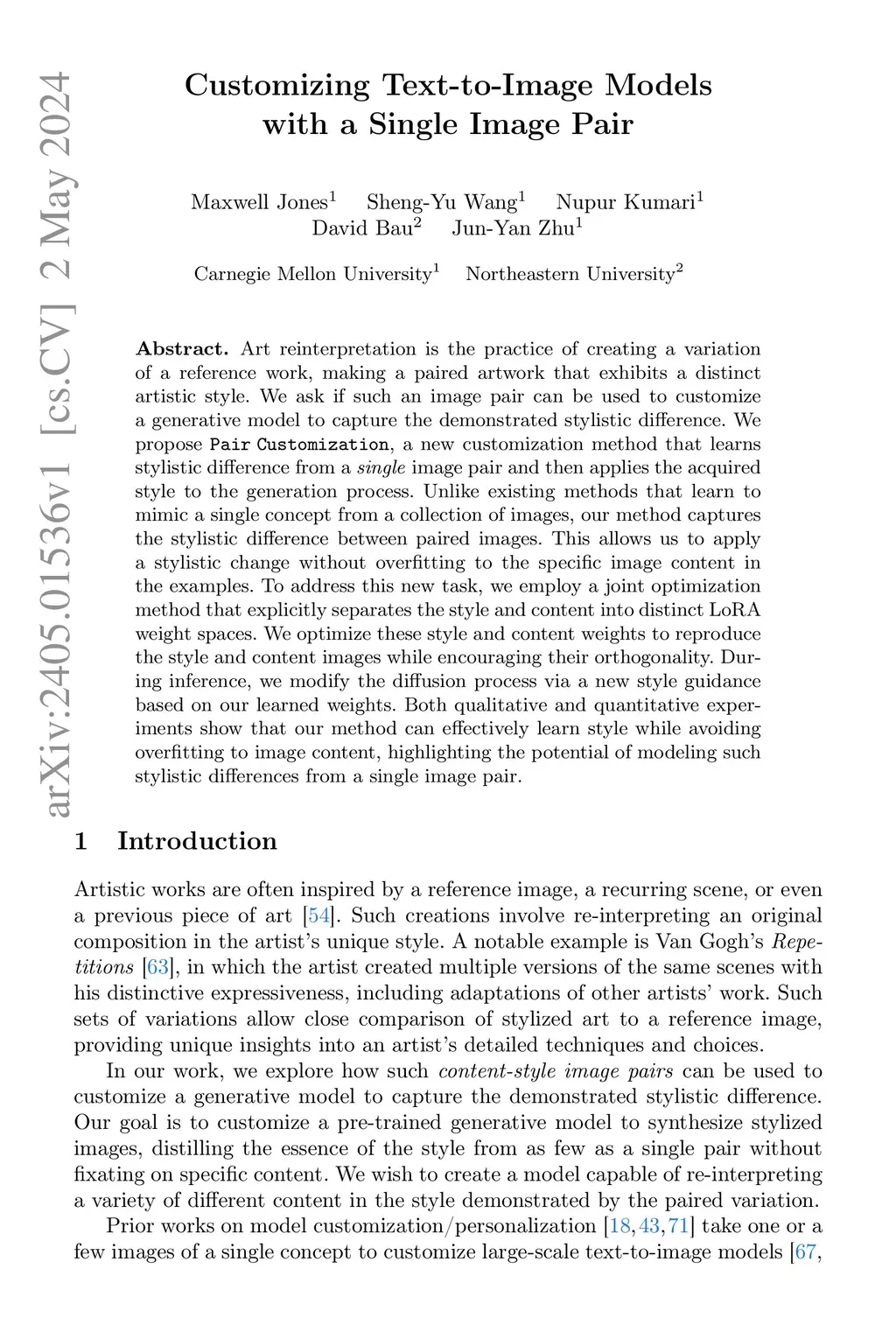 Art reinterpretation is the practice of creating a variation of a reference work, making a paired artwork that exhibits a distinct artistic style. We ask if such an image pair can be used to customize a generative model to capture the demonstrated stylistic difference. We propose Pair Customization, a new customization method that learns stylistic difference from a single image pair and then applies the acquired style to the generation process. Unlike existing methods that learn to mimic a single concept from a collection of images, our method captures the stylistic difference between paired images. This allows us to apply a stylistic change without overfitting to the specific image content in the examples. To address this new task, we employ a joint optimization method that explicitly separates the style and content into distinct LoRA weight spaces. We optimize these style and content weights to reproduce the style and content images while encouraging their orthogonality. During inference, we modify the diffusion process via a new style guidance based on our learned weights. Both qualitative and quantitative experiments show that our method can effectively learn style while avoiding overfitting to image content, highlighting the potential of modeling such stylistic differences from a single image pair.
