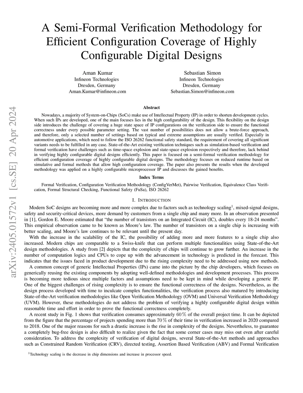 Nowadays, a majority of System-on-Chips (SoCs) make use of Intellectual Property (IP) in order to shorten development cycles. When such IPs are developed, one of the main focuses lies in the high configurability of the design. This flexibility on the design side introduces the challenge of covering a huge state space of IP configurations on the verification side to ensure the functional correctness under every possible parameter setting. The vast number of possibilities does not allow a brute-force approach, and therefore, only a selected number of settings based on typical and extreme assumptions are usually verified. Especially in automotive applications, which need to follow the ISO 26262 functional safety standard, the requirement of covering all significant variants needs to be fulfilled in any case. State-of-the-Art existing verification techniques such as simulation-based verification and formal verification have challenges such as time-space explosion and state-space explosion respectively and therefore, lack behind in verifying highly configurable digital designs efficiently. This paper is focused on a semi-formal verification methodology for efficient configuration coverage of highly configurable digital designs. The methodology focuses on reduced runtime based on simulative and formal methods that allow high configuration coverage. The paper also presents the results when the developed methodology was applied on a highly configurable microprocessor IP and discusses the gained benefits.
