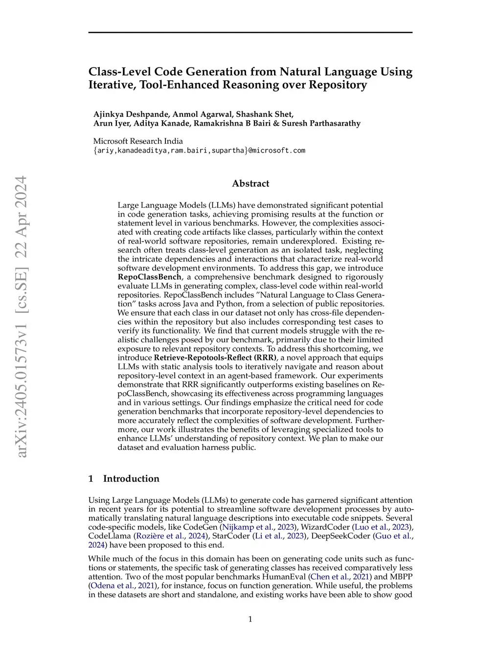 LLMs have demonstrated significant potential in code generation tasks, achieving promising results at the function or statement level across various benchmarks. However, the complexities associated with creating code artifacts like classes, particularly within the context of real-world software repositories, remain underexplored. Prior research treats class-level generation as an isolated task, neglecting the intricate dependencies & interactions that characterize real-world software environments. To address this gap, we introduce RepoClassBench, a comprehensive benchmark designed to rigorously evaluate LLMs in generating complex, class-level code within real-world repositories. RepoClassBench includes "Natural Language to Class generation" tasks across Java, Python & C# from a selection of repositories. We ensure that each class in our dataset not only has cross-file dependencies within the repository but also includes corresponding test cases to verify its functionality. We find that current models struggle with the realistic challenges posed by our benchmark, primarily due to their limited exposure to relevant repository contexts. To address this shortcoming, we introduce Retrieve-Repotools-Reflect (RRR), a novel approach that equips LLMs with static analysis tools to iteratively navigate & reason about repository-level context in an agent-based framework. Our experiments demonstrate that RRR significantly outperforms existing baselines on RepoClassBench, showcasing its effectiveness across programming languages & under various settings. Our findings emphasize the critical need for code-generation benchmarks to incorporate repo-level dependencies to more accurately reflect the complexities of software development. Our work shows the benefits of leveraging specialized tools to enhance LLMs' understanding of repository context. We plan to make our dataset & evaluation harness public.