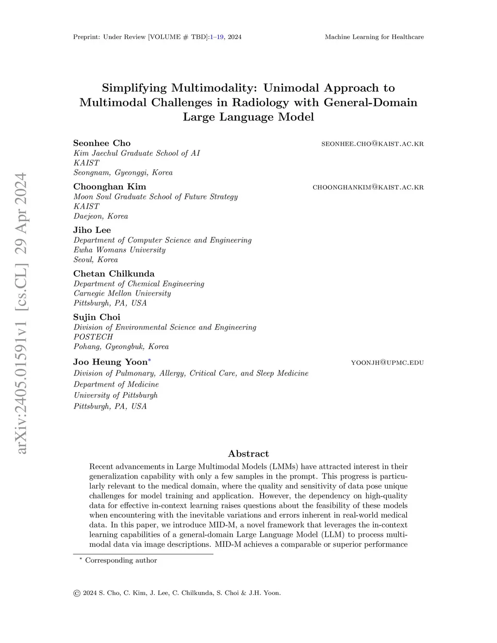Recent advancements in Large Multimodal Models (LMMs) have attracted interest in their generalization capability with only a few samples in the prompt. This progress is particularly relevant to the medical domain, where the quality and sensitivity of data pose unique challenges for model training and application. However, the dependency on high-quality data for effective in-context learning raises questions about the feasibility of these models when encountering with the inevitable variations and errors inherent in real-world medical data. In this paper, we introduce MID-M, a novel framework that leverages the in-context learning capabilities of a general-domain Large Language Model (LLM) to process multimodal data via image descriptions. MID-M achieves a comparable or superior performance to task-specific fine-tuned LMMs and other general-domain ones, without the extensive domain-specific training or pre-training on multimodal data, with significantly fewer parameters. This highlights the potential of leveraging general-domain LLMs for domain-specific tasks and offers a sustainable and cost-effective alternative to traditional LMM developments. Moreover, the robustness of MID-M against data quality issues demonstrates its practical utility in real-world medical domain applications.