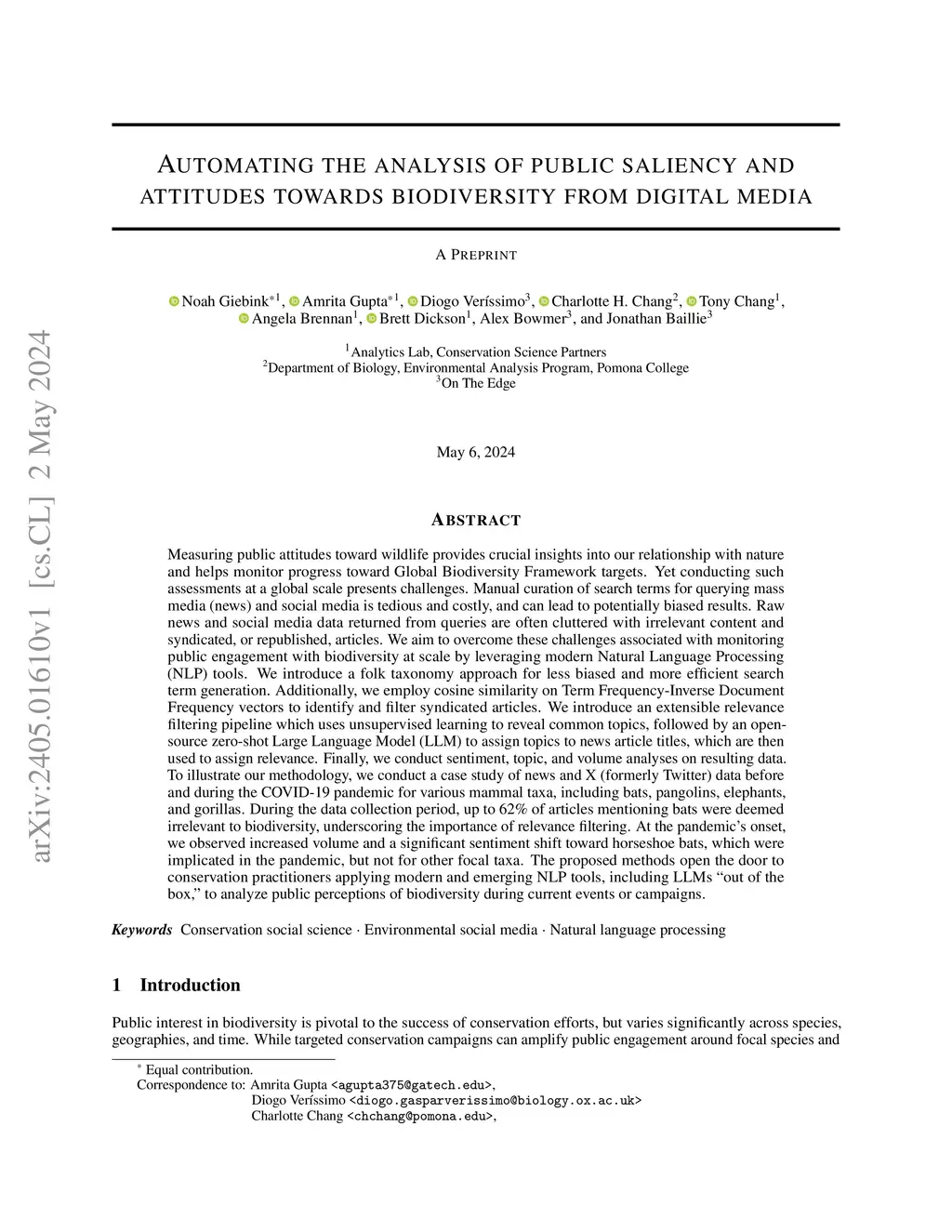 Measuring public attitudes toward wildlife provides crucial insights into our relationship with nature and helps monitor progress toward Global Biodiversity Framework targets. Yet, conducting such assessments at a global scale is challenging. Manually curating search terms for querying news and social media is tedious, costly, and can lead to biased results. Raw news and social media data returned from queries are often cluttered with irrelevant content and syndicated articles. We aim to overcome these challenges by leveraging modern Natural Language Processing (NLP) tools. We introduce a folk taxonomy approach for improved search term generation and employ cosine similarity on Term Frequency-Inverse Document Frequency vectors to filter syndicated articles. We also introduce an extensible relevance filtering pipeline which uses unsupervised learning to reveal common topics, followed by an open-source zero-shot Large Language Model (LLM) to assign topics to news article titles, which are then used to assign relevance. Finally, we conduct sentiment, topic, and volume analyses on resulting data. We illustrate our methodology with a case study of news and X (formerly Twitter) data before and during the COVID-19 pandemic for various mammal taxa, including bats, pangolins, elephants, and gorillas. During the data collection period, up to 62% of articles including keywords pertaining to bats were deemed irrelevant to biodiversity, underscoring the importance of relevance filtering. At the pandemic's onset, we observed increased volume and a significant sentiment shift toward horseshoe bats, which were implicated in the pandemic, but not for other focal taxa. The proposed methods open the door to conservation practitioners applying modern and emerging NLP tools, including LLMs "out of the box," to analyze public perceptions of biodiversity during current events or campaigns.