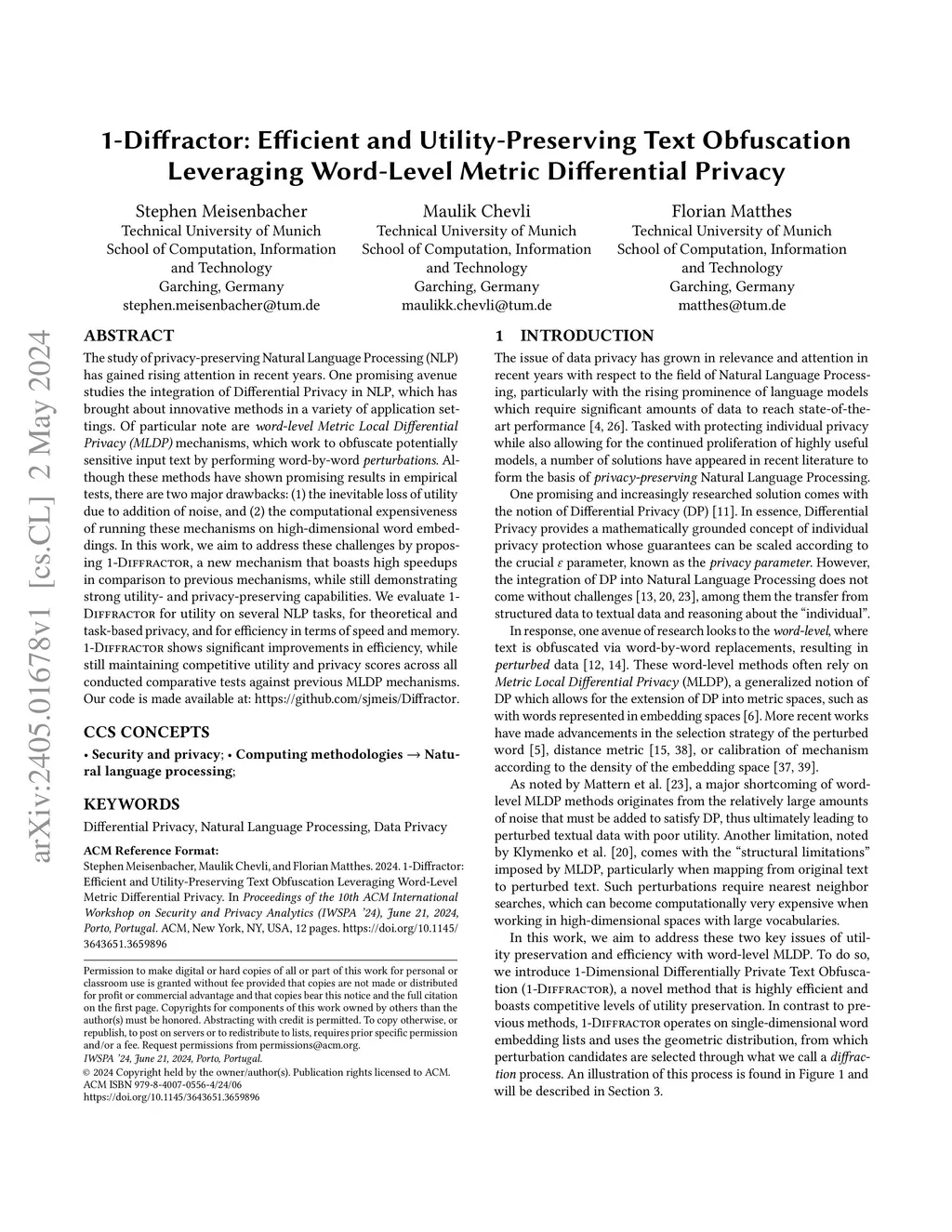 1-Diffractor: Efficient and Utility-Preserving Text Obfuscation