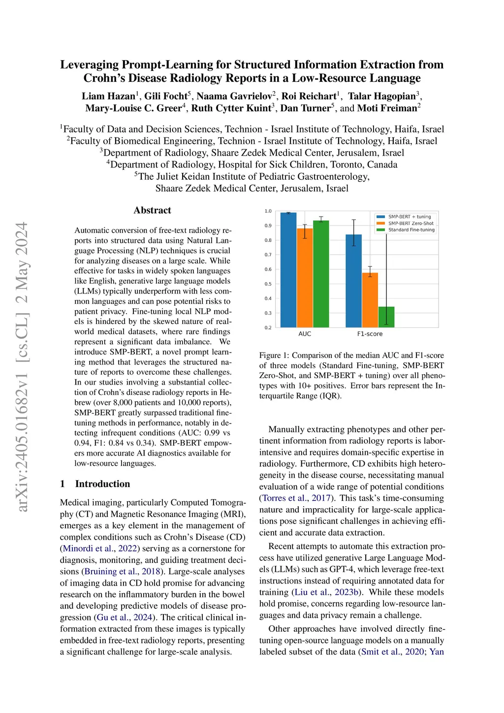 Automatic conversion of free-text radiology reports into structured data using Natural Language Processing (NLP) techniques is crucial for analyzing diseases on a large scale. While effective for tasks in widely spoken languages like English, generative large language models (LLMs) typically underperform with less common languages and can pose potential risks to patient privacy. Fine-tuning local NLP models is hindered by the skewed nature of real-world medical datasets, where rare findings represent a significant data imbalance. We introduce SMP-BERT, a novel prompt learning method that leverages the structured nature of reports to overcome these challenges. In our studies involving a substantial collection of Crohn's disease radiology reports in Hebrew (over 8,000 patients and 10,000 reports), SMP-BERT greatly surpassed traditional fine-tuning methods in performance, notably in detecting infrequent conditions (AUC: 0.99 vs 0.94, F1: 0.84 vs 0.34). SMP-BERT empowers more accurate AI diagnostics available for low-resource languages.