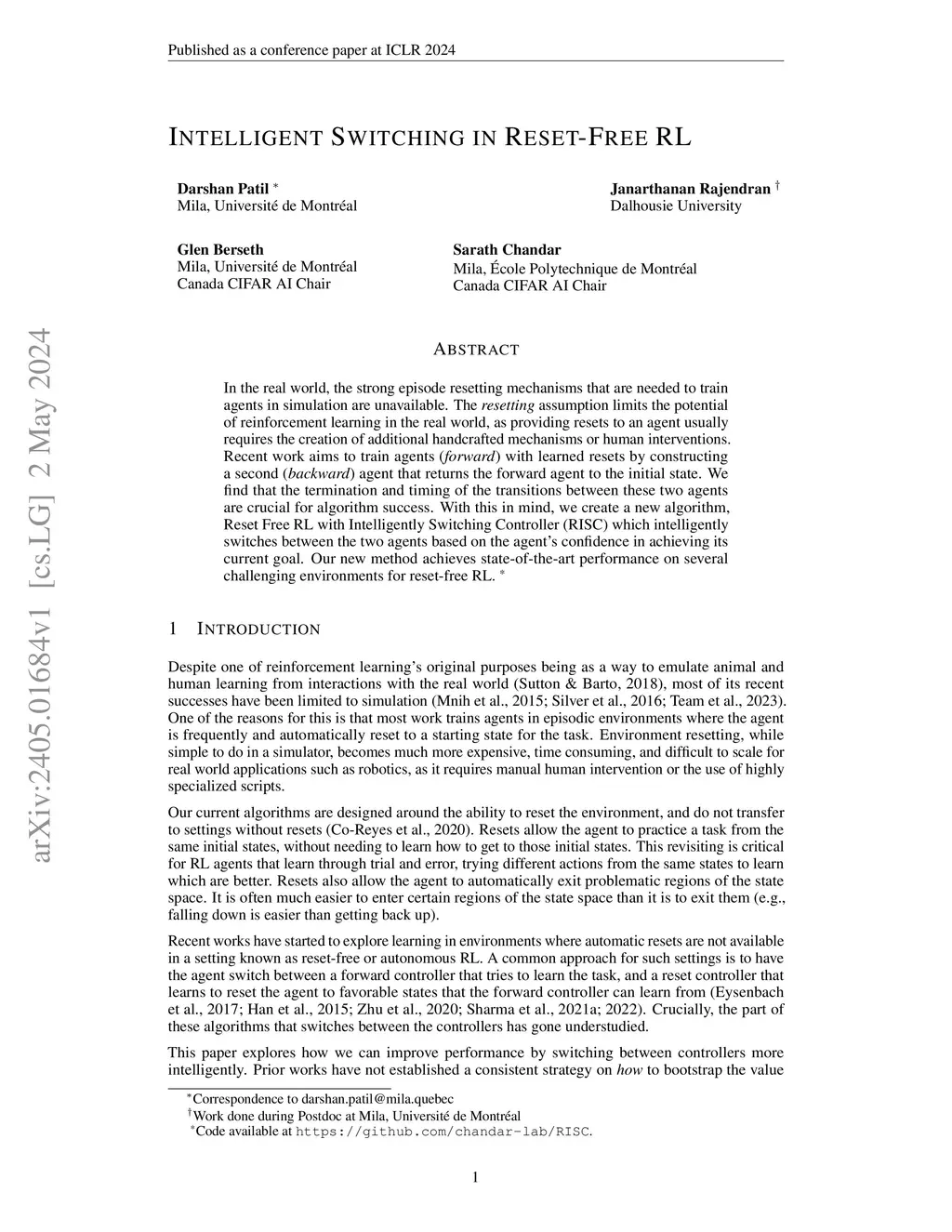 In the real world, the strong episode resetting mechanisms that are needed to train agents in simulation are unavailable. The \textit{resetting} assumption limits the potential of reinforcement learning in the real world, as providing resets to an agent usually requires the creation of additional handcrafted mechanisms or human interventions. Recent work aims to train agents (\textit{forward}) with learned resets by constructing a second (\textit{backward}) agent that returns the forward agent to the initial state. We find that the termination and timing of the transitions between these two agents are crucial for algorithm success. With this in mind, we create a new algorithm, Reset Free RL with Intelligently Switching Controller (RISC) which intelligently switches between the two agents based on the agent's confidence in achieving its current goal. Our new method achieves state-of-the-art performance on several challenging environments for reset-free RL.