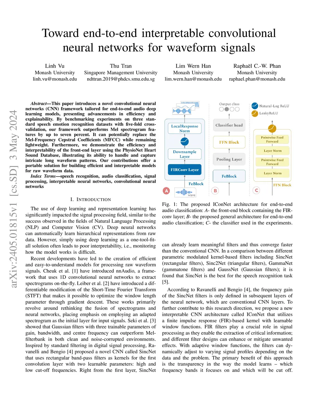 This paper introduces a novel convolutional neural networks (CNN) framework tailored for end-to-end audio deep learning models, presenting advancements in efficiency and explainability. By benchmarking experiments on three standard speech emotion recognition datasets with five-fold cross-validation, our framework outperforms Mel spectrogram features by up to seven percent. It can potentially replace the Mel-Frequency Cepstral Coefficients (MFCC) while remaining lightweight. Furthermore, we demonstrate the efficiency and interpretability of the front-end layer using the PhysioNet Heart Sound Database, illustrating its ability to handle and capture intricate long waveform patterns. Our contributions offer a portable solution for building efficient and interpretable models for raw waveform data.