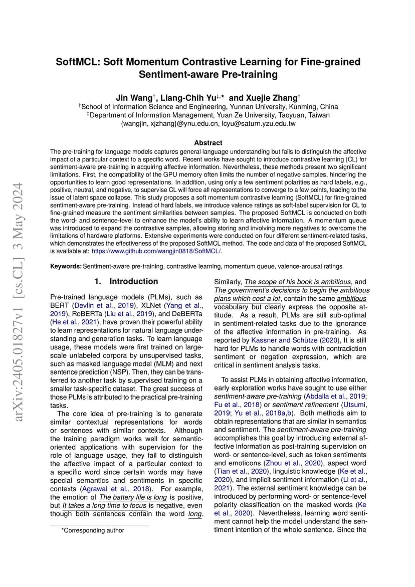 The pre-training for language models captures general language understanding but fails to distinguish the affective impact of a particular context to a specific word. Recent works have sought to introduce contrastive learning (CL) for sentiment-aware pre-training in acquiring affective information. Nevertheless, these methods present two significant limitations. First, the compatibility of the GPU memory often limits the number of negative samples, hindering the opportunities to learn good representations. In addition, using only a few sentiment polarities as hard labels, e.g., positive, neutral, and negative, to supervise CL will force all representations to converge to a few points, leading to the issue of latent space collapse. This study proposes a soft momentum contrastive learning (SoftMCL) for fine-grained sentiment-aware pre-training. Instead of hard labels, we introduce valence ratings as soft-label supervision for CL to fine-grained measure the sentiment similarities between samples. The proposed SoftMCL is conducted on both the word- and sentence-level to enhance the model's ability to learn affective information. A momentum queue was introduced to expand the contrastive samples, allowing storing and involving more negatives to overcome the limitations of hardware platforms. Extensive experiments were conducted on four different sentiment-related tasks, which demonstrates the effectiveness of the proposed SoftMCL method. The code and data of the proposed SoftMCL is available at: https://www.github.com/wangjin0818/SoftMCL/.
