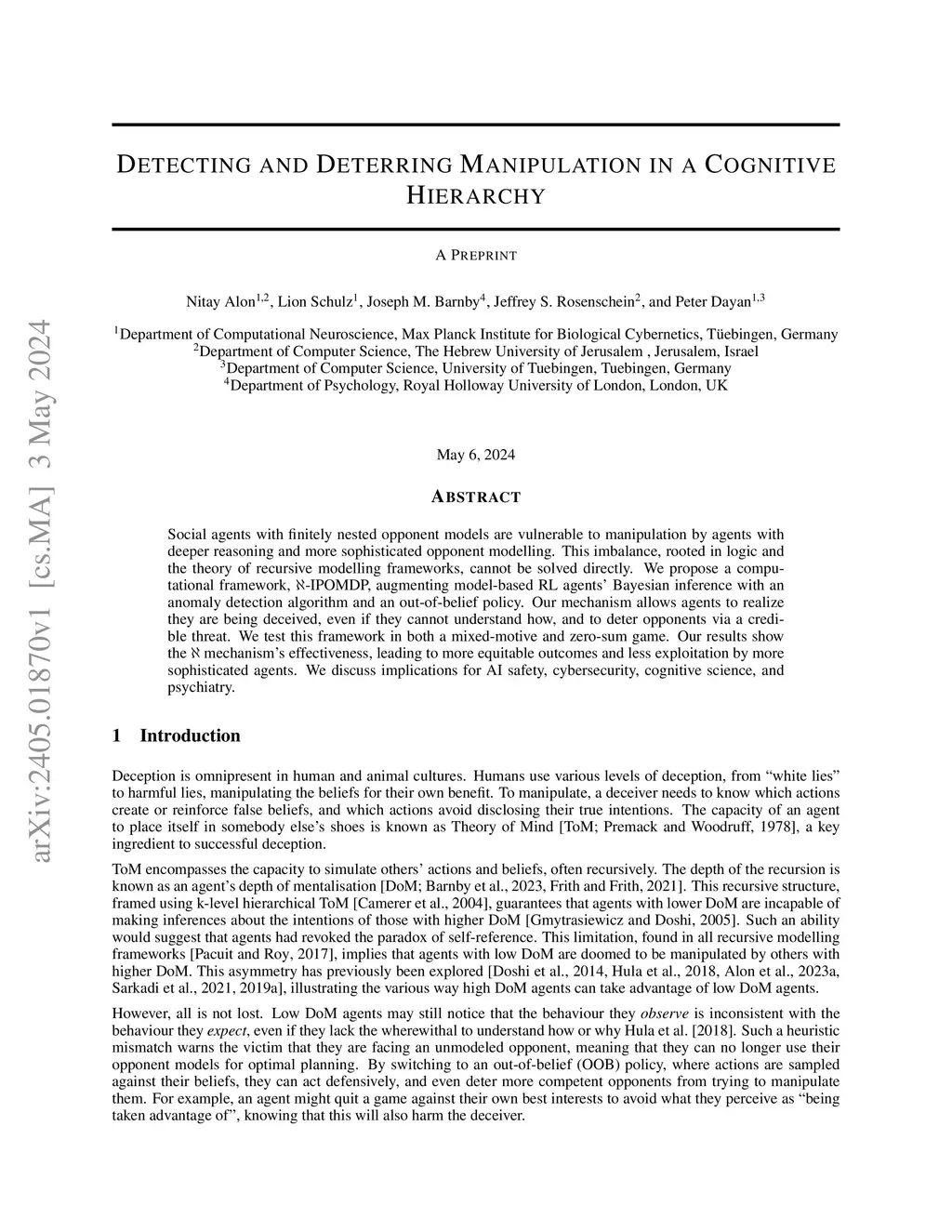 Social agents with finitely nested opponent models are vulnerable to manipulation by agents with deeper recursive capabilities. This imbalance, rooted in logic and the theory of recursive modelling frameworks, cannot be solved directly. We propose a computational framework called -IPOMDP, which augments the Bayesian inference of model-based RL agents with an anomaly detection algorithm and an out-of-belief policy. Our mechanism allows agents to realize that they are being deceived, even if they cannot understand how, and to deter opponents via a credible threat. We test this framework in both a mixed-motive and a zero-sum game. Our results demonstrate the -mechanism's effectiveness, leading to more equitable outcomes and less exploitation by more sophisticated agents. We discuss implications for AI safety, cybersecurity, cognitive science, and psychiatry.