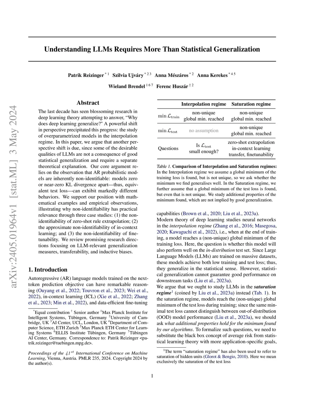 The last decade has seen blossoming research in deep learning theory attempting to answer, "Why does deep learning generalize?" A powerful shift in perspective precipitated this progress: the study of overparametrized models in the interpolation regime. In this paper, we argue that another perspective shift is due, since some of the desirable qualities of LLMs are not a consequence of good statistical generalization and require a separate theoretical explanation. Our core argument relies on the observation that AR probabilistic models are inherently non-identifiable: models zero or near-zero KL divergence apart -- thus, equivalent test loss -- can exhibit markedly different behaviors. We support our position with mathematical examples and empirical observations, illustrating why non-identifiability has practical relevance through three case studies: (1) the non-identifiability of zero-shot rule extrapolation; (2) the approximate non-identifiability of in-context learning; and (3) the non-identifiability of fine-tunability. We review promising research directions focusing on LLM-relevant generalization measures, transferability, and inductive biases.