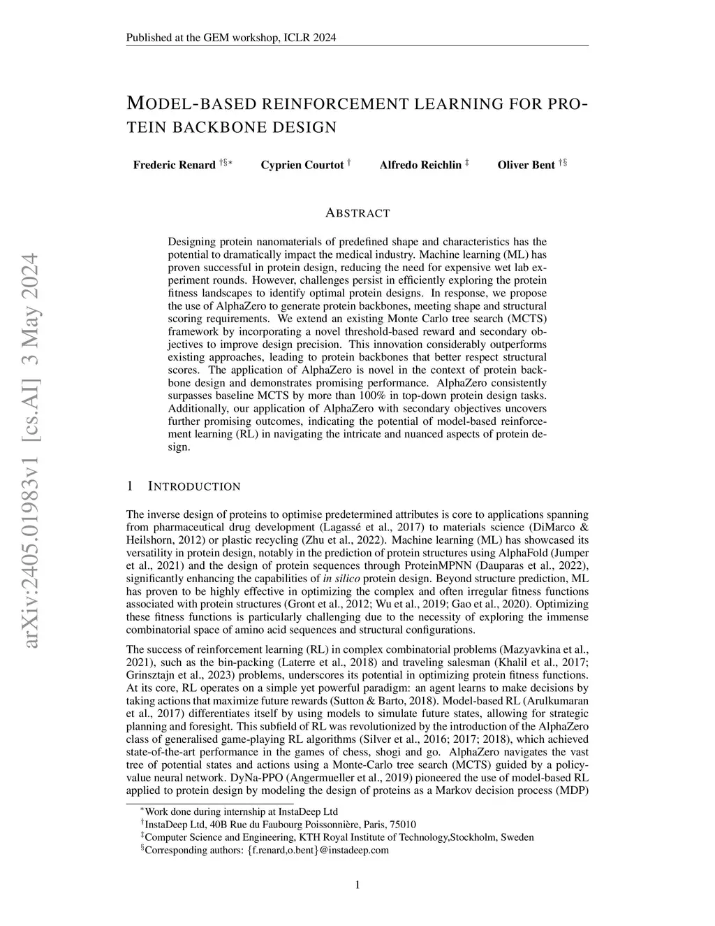 Designing protein nanomaterials of predefined shape and characteristics has the potential to dramatically impact the medical industry. Machine learning (ML) has proven successful in protein design, reducing the need for expensive wet lab experiment rounds. However, challenges persist in efficiently exploring the protein fitness landscapes to identify optimal protein designs. In response, we propose the use of AlphaZero to generate protein backbones, meeting shape and structural scoring requirements. We extend an existing Monte Carlo tree search (MCTS) framework by incorporating a novel threshold-based reward and secondary objectives to improve design precision. This innovation considerably outperforms existing approaches, leading to protein backbones that better respect structural scores. The application of AlphaZero is novel in the context of protein backbone design and demonstrates promising performance. AlphaZero consistently surpasses baseline MCTS by more than 100% in top-down protein design tasks. Additionally, our application of AlphaZero with secondary objectives uncovers further promising outcomes, indicating the potential of model-based reinforcement learning (RL) in navigating the intricate and nuanced aspects of protein design