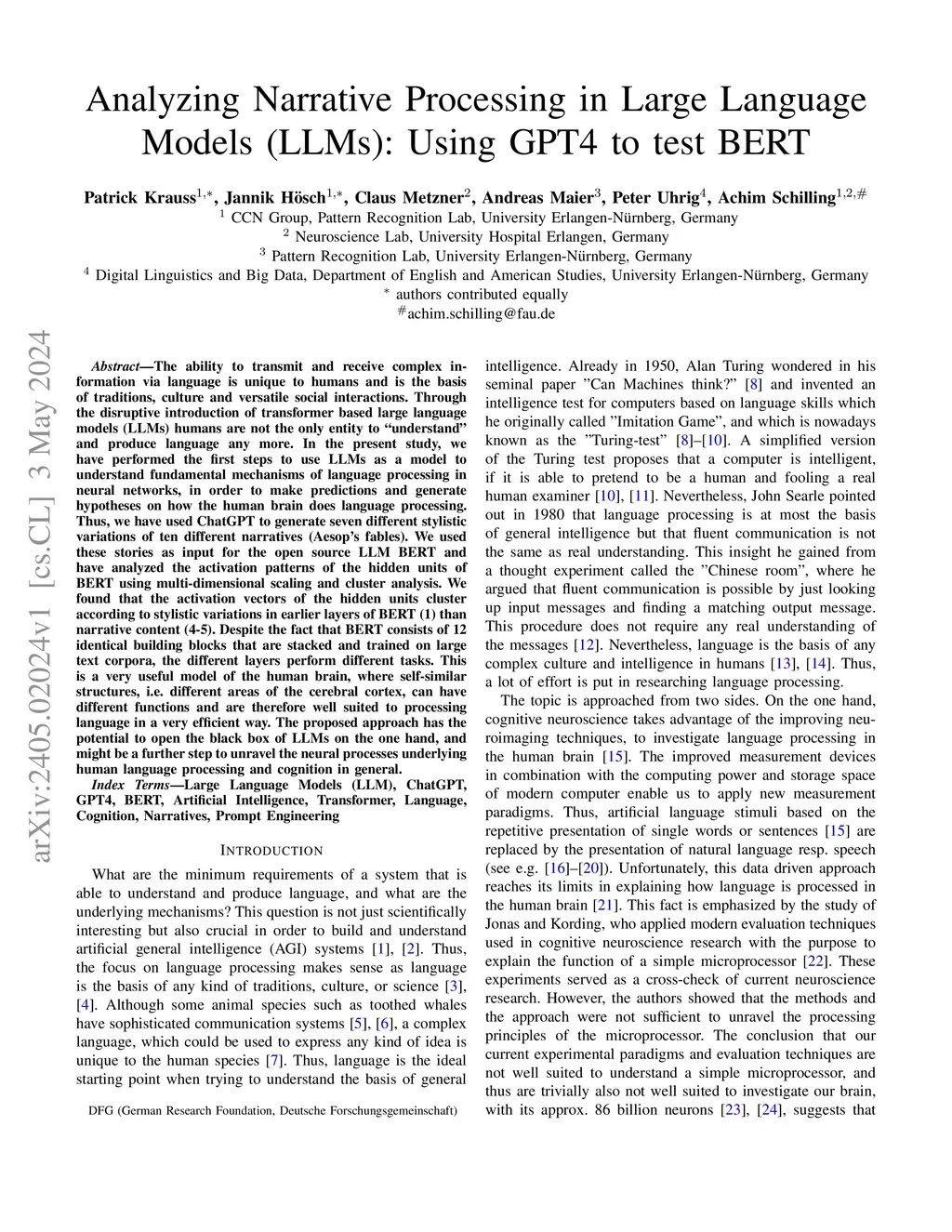 The ability to transmit and receive complex information via language is unique to humans and is the basis of traditions, culture and versatile social interactions. Through the disruptive introduction of transformer based large language models (LLMs) humans are not the only entity to "understand" and produce language any more. In the present study, we have performed the first steps to use LLMs as a model to understand fundamental mechanisms of language processing in neural networks, in order to make predictions and generate hypotheses on how the human brain does language processing. Thus, we have used ChatGPT to generate seven different stylistic variations of ten different narratives (Aesop's fables). We used these stories as input for the open source LLM BERT and have analyzed the activation patterns of the hidden units of BERT using multi-dimensional scaling and cluster analysis. We found that the activation vectors of the hidden units cluster according to stylistic variations in earlier layers of BERT (1) than narrative content (4-5). Despite the fact that BERT consists of 12 identical building blocks that are stacked and trained on large text corpora, the different layers perform different tasks. This is a very useful model of the human brain, where self-similar structures, i.e. different areas of the cerebral cortex, can have different functions and are therefore well suited to processing language in a very efficient way. The proposed approach has the potential to open the black box of LLMs on the one hand, and might be a further step to unravel the neural processes underlying human language processing and cognition in general.