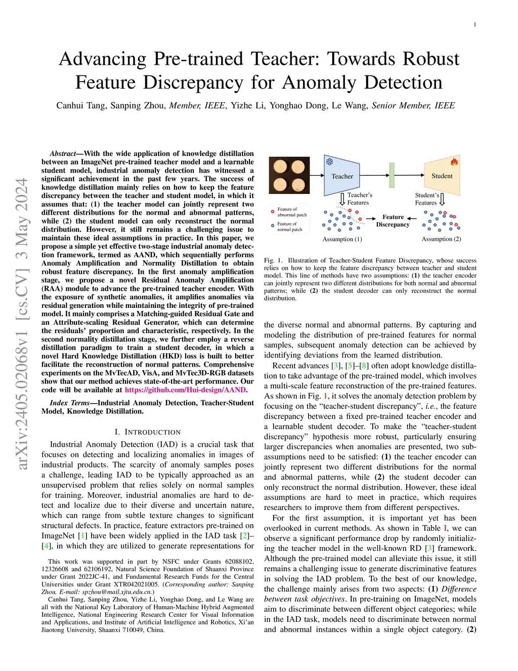 With the wide application of knowledge distillation between an ImageNet pre-trained teacher model and a learnable student model, industrial anomaly detection has witnessed a significant achievement in the past few years. The success of knowledge distillation mainly relies on how to keep the feature discrepancy between the teacher and student model, in which it assumes that: (1) the teacher model can jointly represent two different distributions for the normal and abnormal patterns, while (2) the student model can only reconstruct the normal distribution. However, it still remains a challenging issue to maintain these ideal assumptions in practice. In this paper, we propose a simple yet effective two-stage industrial anomaly detection framework, termed as AAND, which sequentially performs Anomaly Amplification and Normality Distillation to obtain robust feature discrepancy. In the first anomaly amplification stage, we propose a novel Residual Anomaly Amplification (RAA) module to advance the pre-trained teacher encoder. With the exposure of synthetic anomalies, it amplifies anomalies via residual generation while maintaining the integrity of pre-trained model. It mainly comprises a Matching-guided Residual Gate and an Attribute-scaling Residual Generator, which can determine the residuals' proportion and characteristic, respectively. In the second normality distillation stage, we further employ a reverse distillation paradigm to train a student decoder, in which a novel Hard Knowledge Distillation (HKD) loss is built to better facilitate the reconstruction of normal patterns. Comprehensive experiments on the MvTecAD, VisA, and MvTec3D-RGB datasets show that our method achieves state-of-the-art performance.