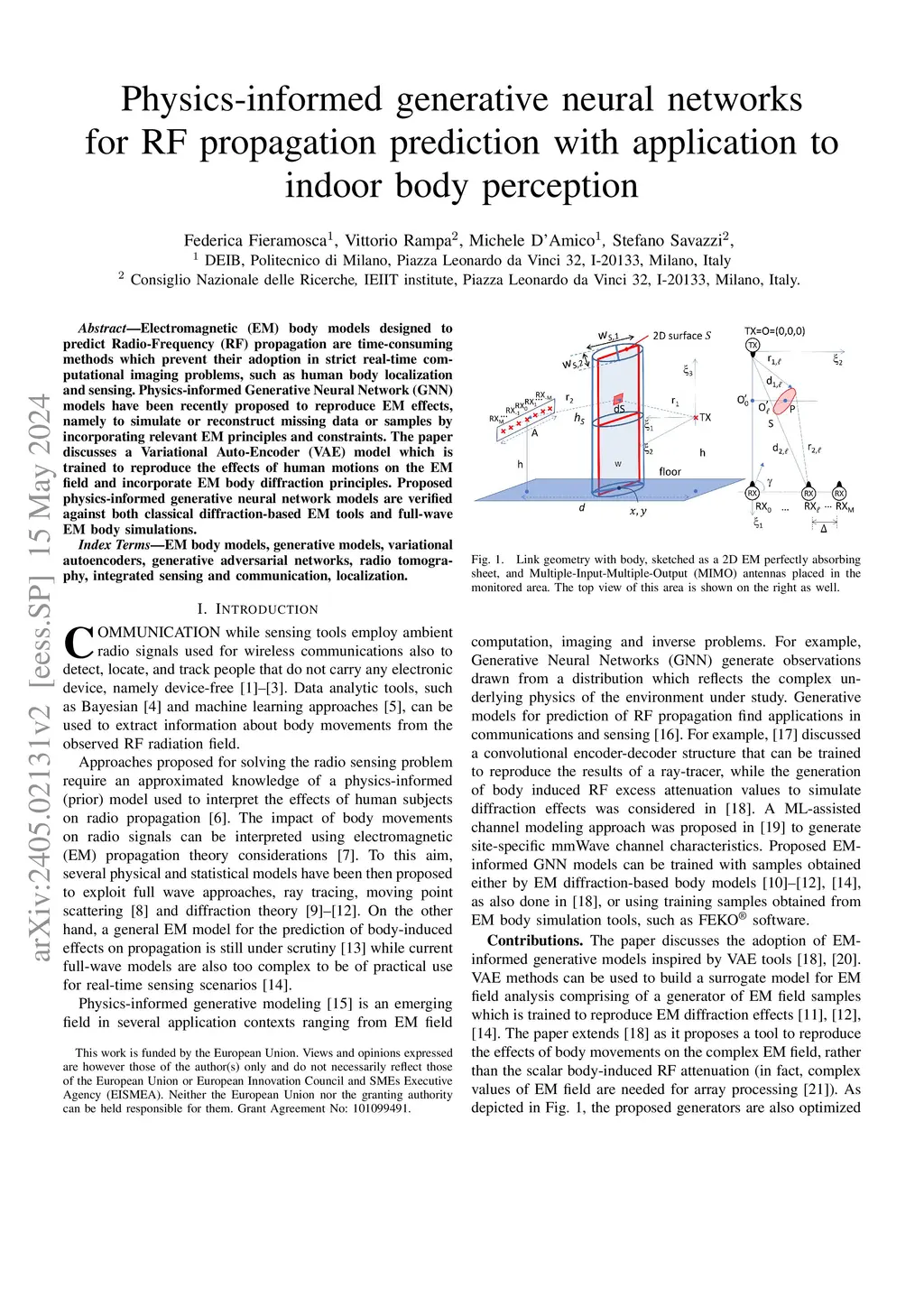 Electromagnetic (EM) body models designed to predict Radio-Frequency (RF) propagation are time-consuming methods which prevent their adoption in strict real-time computational imaging problems, such as human body localization and sensing. Physics-informed Generative Neural Network (GNN) models have been recently proposed to reproduce EM effects, namely to simulate or reconstruct missing data or samples by incorporating relevant EM principles and constraints. The paper discusses a Variational Auto-Encoder (VAE) model which is trained to reproduce the effects of human motions on the EM field and incorporate EM body diffraction principles. Proposed physics-informed generative neural network models are verified against both classical diffraction-based EM tools and full-wave EM body simulations.