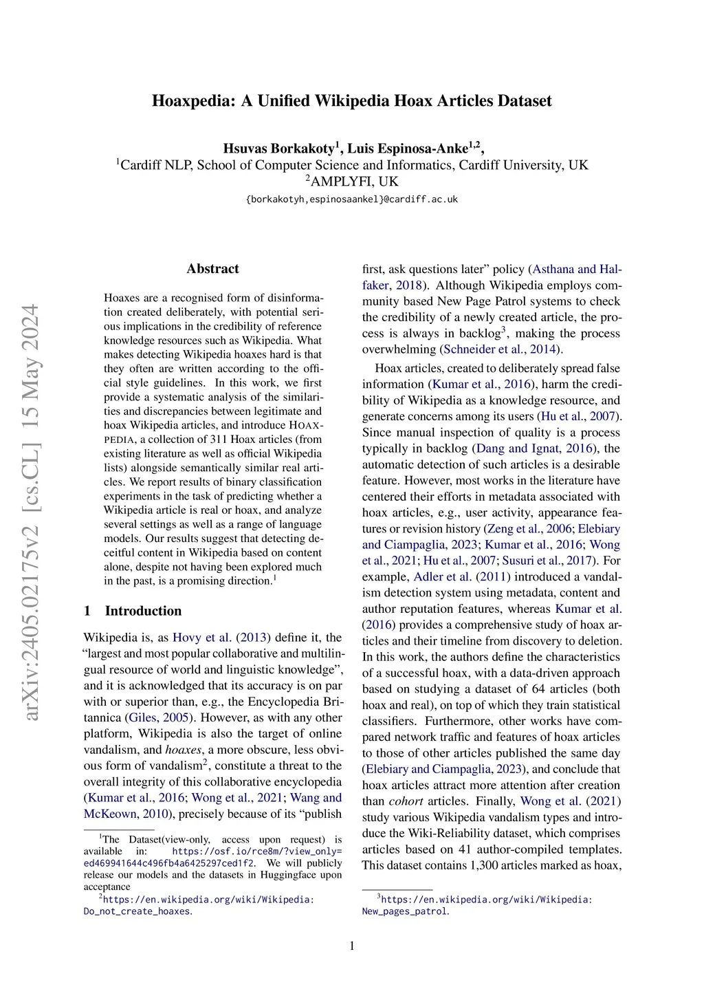 Hoaxpedia: A Unified Wikipedia Hoax Articles Dataset