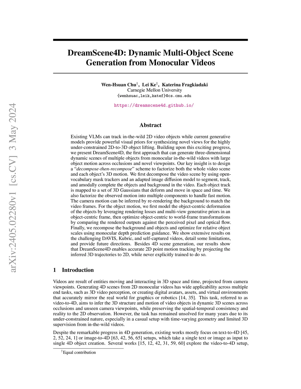 View-predictive generative models provide strong priors for lifting object-centric images and videos into 3D and 4D through rendering and score distillation objectives. A question then remains: what about lifting complete multi-object dynamic scenes? There are two challenges in this direction: First, rendering error gradients are often insufficient to recover fast object motion, and second, view predictive generative models work much better for objects than whole scenes, so, score distillation objectives cannot currently be applied at the scene level directly. We present DreamScene4D, the first approach to generate 3D dynamic scenes of multiple objects from monocular videos via 360-degree novel view synthesis. Our key insight is a "decompose-recompose" approach that factorizes the video scene into the background and object tracks, while also factorizing object motion into 3 components: object-centric deformation, object-to-world-frame transformation, and camera motion. Such decomposition permits rendering error gradients and object view-predictive models to recover object 3D completions and deformations while bounding box tracks guide the large object movements in the scene. We show extensive results on challenging DAVIS, Kubric, and self-captured videos with quantitative comparisons and a user preference study. Besides 4D scene generation, DreamScene4D obtains accurate 2D persistent point track by projecting the inferred 3D trajectories to 2D. We will release our code and hope our work will stimulate more research on fine-grained 4D understanding from videos.