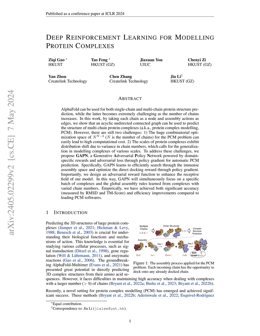 AlphaFold can be used for both single-chain and multi-chain protein structure prediction, while the latter becomes extremely challenging as the number of chains increases. In this work, by taking each chain as a node and assembly actions as edges, we show that an acyclic undirected connected graph can be used to predict the structure of multi-chain protein complexes (a.k.a., protein complex modelling, PCM). However, there are still two challenges: 1) The huge combinatorial optimization space of ( is the number of chains) for the PCM problem can easily lead to high computational cost. 2) The scales of protein complexes exhibit distribution shift due to variance in chain numbers, which calls for the generalization in modelling complexes of various scales. To address these challenges, we propose GAPN, a Generative Adversarial Policy Network powered by domain-specific rewards and adversarial loss through policy gradient for automatic PCM prediction. Specifically, GAPN learns to efficiently search through the immense assembly space and optimize the direct docking reward through policy gradient. Importantly, we design an adversarial reward function to enhance the receptive field of our model. In this way, GAPN will simultaneously focus on a specific batch of complexes and the global assembly rules learned from complexes with varied chain numbers. Empirically, we have achieved both significant accuracy (measured by RMSD and TM-Score) and efficiency improvements compared to leading PCM softwares.