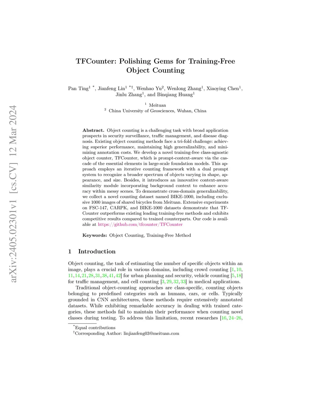 Object counting is a challenging task with broad application prospects in security surveillance, traffic management, and disease diagnosis. Existing object counting methods face a tri-fold challenge: achieving superior performance, maintaining high generalizability, and minimizing annotation costs. We develop a novel training-free class-agnostic object counter, TFCounter, which is prompt-context-aware via the cascade of the essential elements in large-scale foundation models. This approach employs an iterative counting framework with a dual prompt system to recognize a broader spectrum of objects varying in shape, appearance, and size. Besides, it introduces an innovative context-aware similarity module incorporating background context to enhance accuracy within messy scenes. To demonstrate cross-domain generalizability, we collect a novel counting dataset named BIKE-1000, including exclusive 1000 images of shared bicycles from Meituan. Extensive experiments on FSC-147, CARPK, and BIKE-1000 datasets demonstrate that TFCounter outperforms existing leading training-free methods and exhibits competitive results compared to trained counterparts.