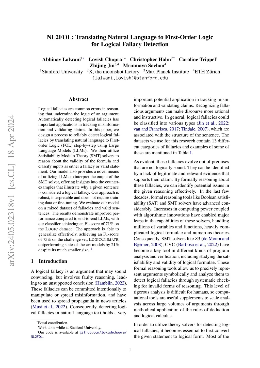 Translating natural language into formal language such as First-Order Logic (FOL) is a foundational challenge in NLP with wide-ranging applications in automated reasoning, misinformation tracking, and knowledge validation. In this paper, we introduce Natural Language to First-Order Logic (NL2FOL), a framework to autoformalize natural language to FOL step by step using Large Language Models (LLMs). Our approach addresses key challenges in this translation process, including the integration of implicit background knowledge. By leveraging structured representations generated by NL2FOL, we use Satisfiability Modulo Theory (SMT) solvers to reason about the logical validity of natural language statements. We present logical fallacy detection as a case study to evaluate the efficacy of NL2FOL. Being neurosymbolic, our approach also provides interpretable insights into the reasoning process and demonstrates robustness without requiring model fine-tuning or labeled training data. Our framework achieves strong performance on multiple datasets. On the LOGIC dataset, NL2FOL achieves an F1-score of 78%, while generalizing effectively to the LOGICCLIMATE dataset with an F1-score of 80%.