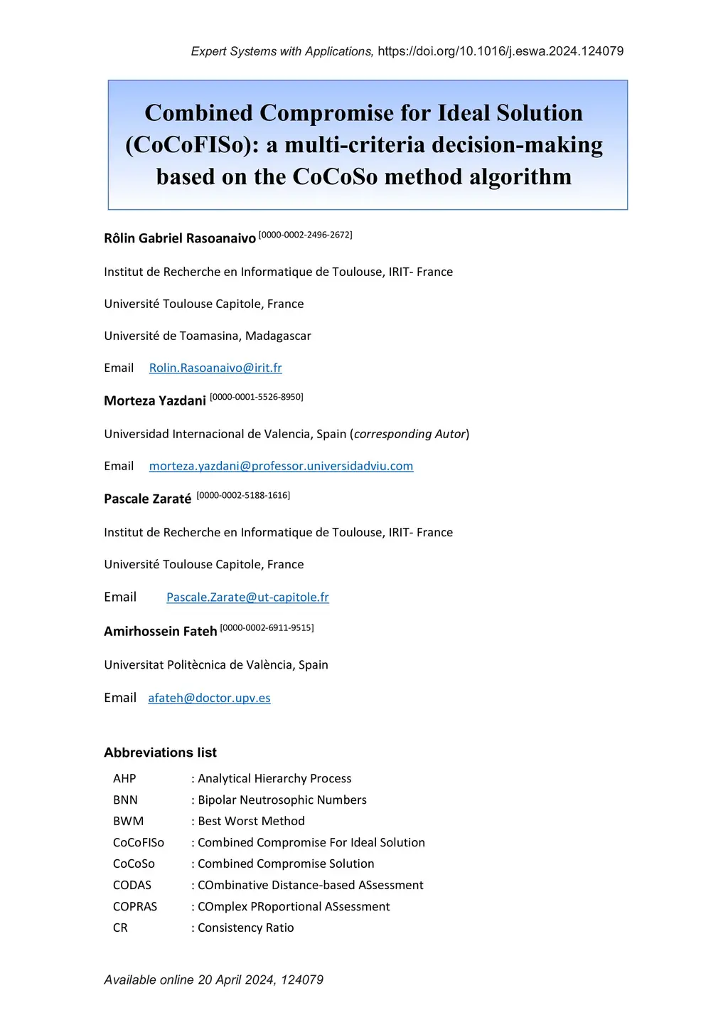 Each decision-making tool should be tested and validated in real case studies to be practical and fit to global problems. The application of multi-criteria decision-making methods (MCDM) is currently a trend to rank alternatives. In the literature, there are several multi-criteria decision-making methods according to their classification. During our experimentation on the Combined Compromise Solution (CoCoSo) method, we encountered its limits for real cases. The authors examined the applicability of the CoCoFISo method (improved version of combined compromise solution), by a real case study in a university campus and compared the obtained results to other MCDMs such as Preference Ranking Organisation Method for Enrichment Evaluations (PROMETHEE), Weighted Sum Method (WSM) and Technique for Order Preference by Similarity to the Ideal Solution (TOPSIS). Our research finding indicates that CoCoSo is an applied method that has been developed to solve complex multi variable assessment problems, while CoCoFISo can improve the shortages observed in CoCoSo and deliver stable outcomes compared to other developed tools. The findings imply that application of CoCoFISo is suggested to decision makers, experts and researchers while they are facing practical challenges and sensitive questions regarding the utilization of a reliable decision-making method. Unlike many prior studies, the current version of CoCoSo is unique, original and is presented for the first time. Its performance was approved using several strategies and examinations.