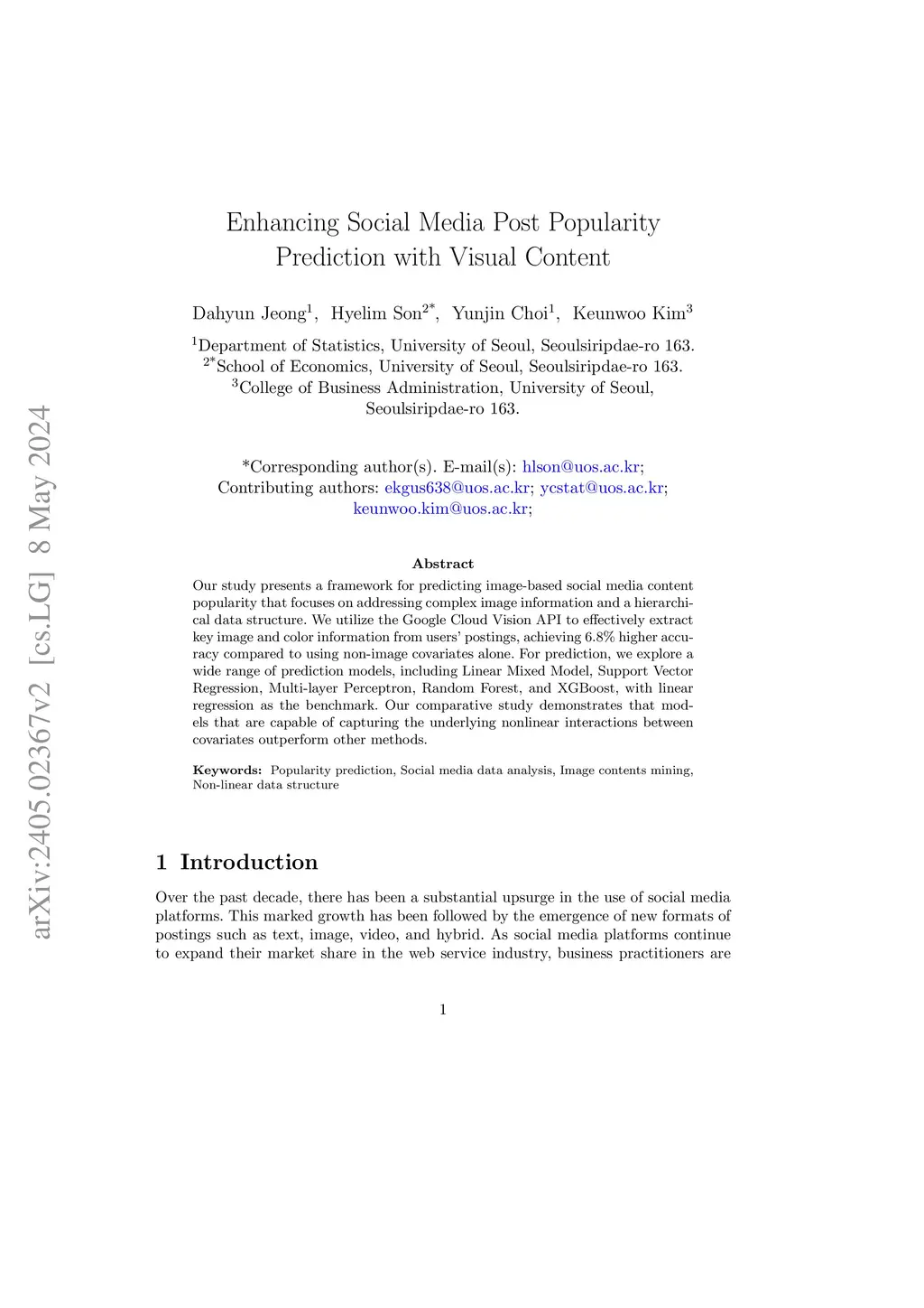 Our study presents a framework for predicting image-based social media content popularity that focuses on addressing complex image information and a hierarchical data structure. We utilize the Google Cloud Vision API to effectively extract key image and color information from users' postings, achieving 6.8% higher accuracy compared to using non-image covariates alone. For prediction, we explore a wide range of prediction models, including Linear Mixed Model, Support Vector Regression, Multi-layer Perceptron, Random Forest, and XGBoost, with linear regression as the benchmark. Our comparative study demonstrates that models that are capable of capturing the underlying nonlinear interactions between covariates outperform other methods.