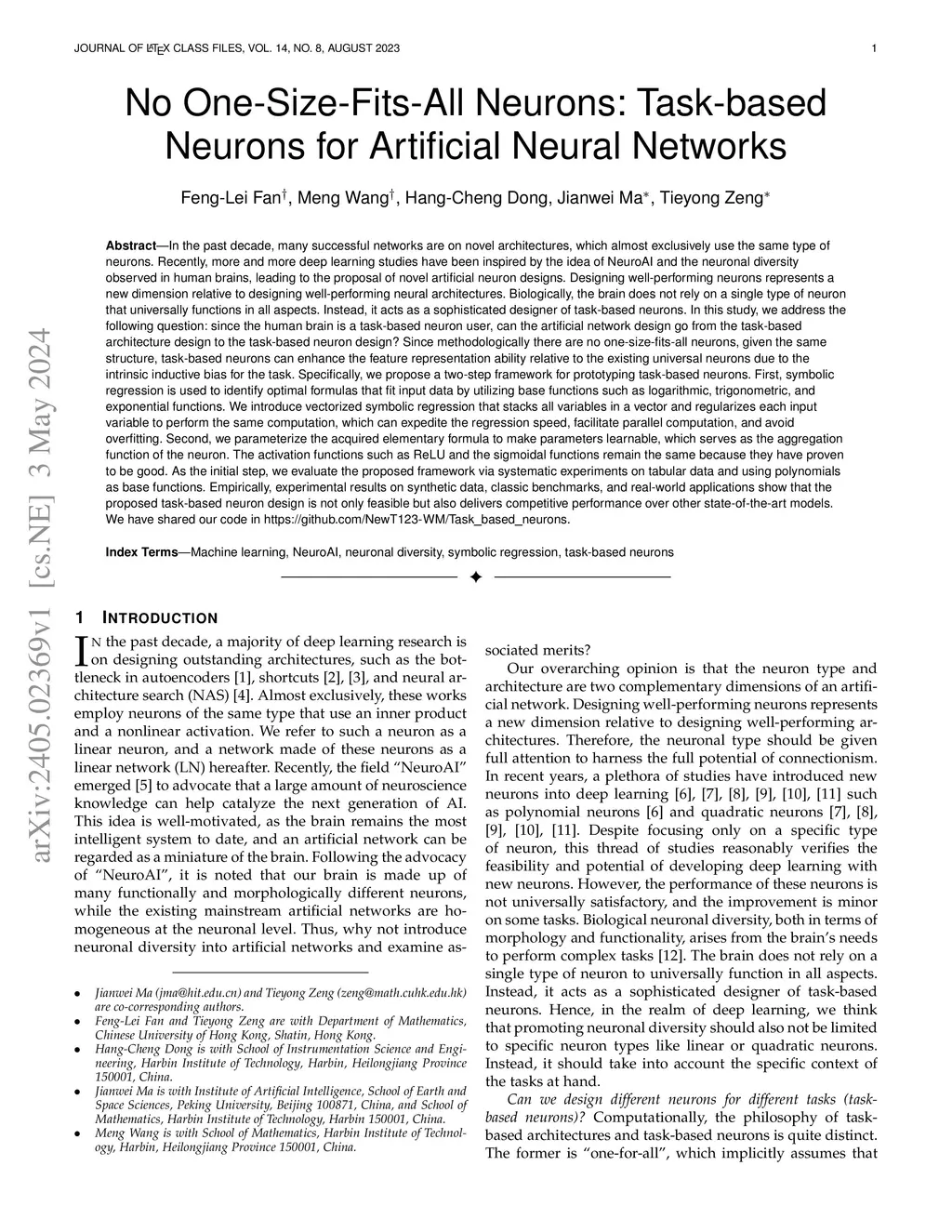 Biologically, the brain does not rely on a single type of neuron that universally functions in all aspects. Instead, it acts as a sophisticated designer of task-based neurons. In this study, we address the following question: since the human brain is a task-based neuron user, can the artificial network design go from the task-based architecture design to the task-based neuron design? Since methodologically there are no one-size-fits-all neurons, given the same structure, task-based neurons can enhance the feature representation ability relative to the existing universal neurons due to the intrinsic inductive bias for the task. Specifically, we propose a two-step framework for prototyping task-based neurons. First, symbolic regression is used to identify optimal formulas that fit input data by utilizing base functions such as logarithmic, trigonometric, and exponential functions. We introduce vectorized symbolic regression that stacks all variables in a vector and regularizes each input variable to perform the same computation, which can expedite the regression speed, facilitate parallel computation, and avoid overfitting. Second, we parameterize the acquired elementary formula to make parameters learnable, which serves as the aggregation function of the neuron. The activation functions such as ReLU and the sigmoidal functions remain the same because they have proven to be good. Empirically, experimental results on synthetic data, classic benchmarks, and real-world applications show that the proposed task-based neuron design is not only feasible but also delivers competitive performance over other state-of-the-art models.