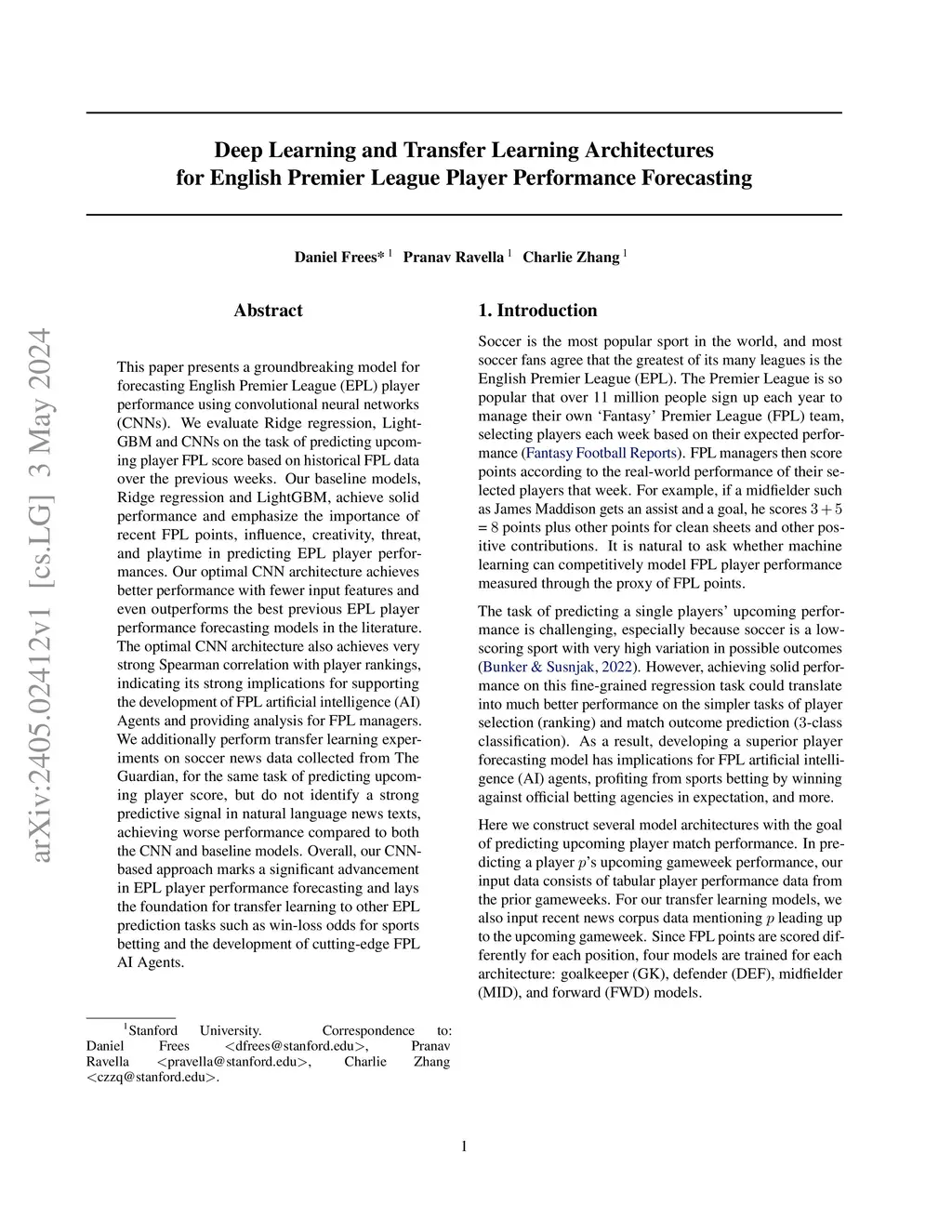 Deep Learning and Transfer Learning Architectures for English Premier