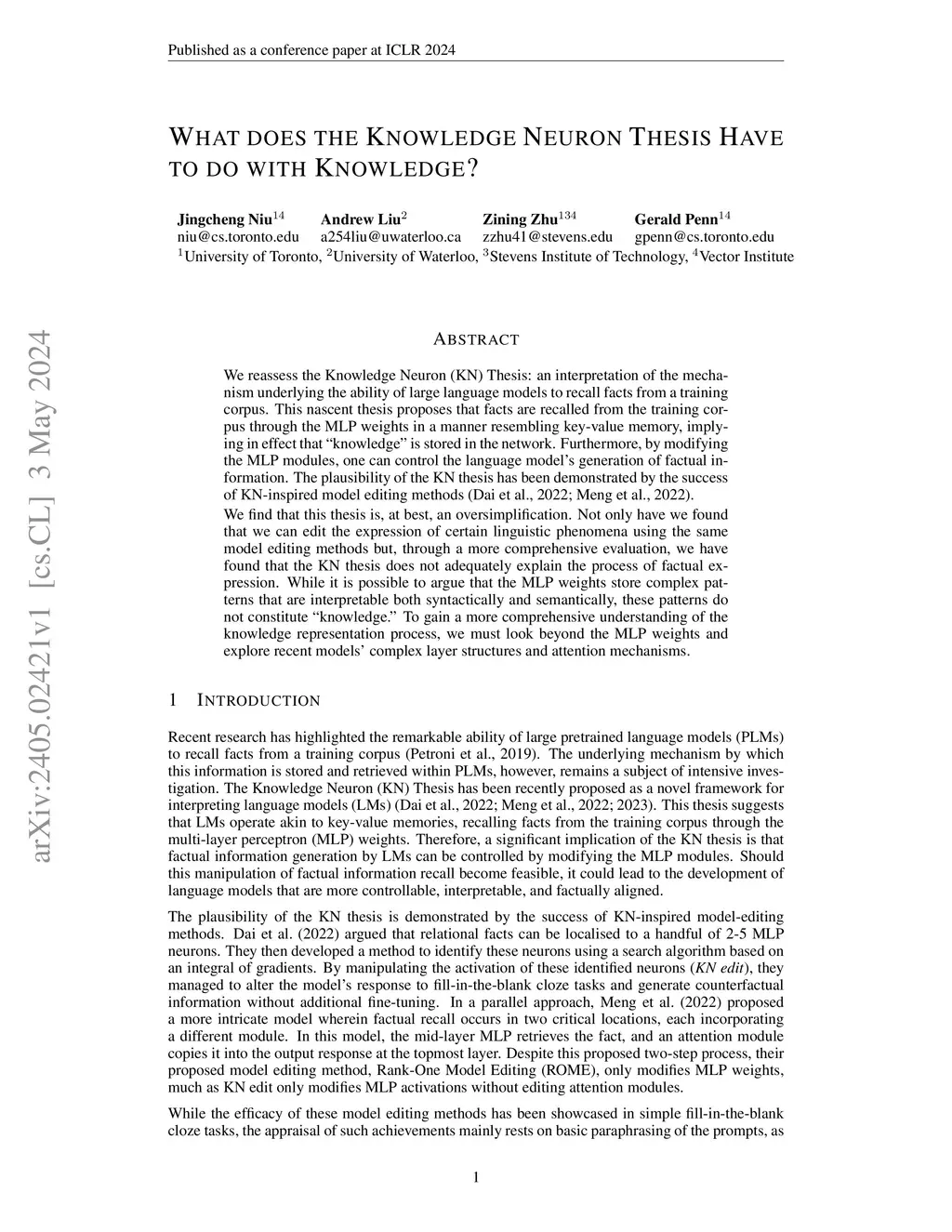 We reassess the Knowledge Neuron (KN) Thesis: an interpretation of the mechanism underlying the ability of large language models to recall facts from a training corpus. This nascent thesis proposes that facts are recalled from the training corpus through the MLP weights in a manner resembling key-value memory, implying in effect that "knowledge" is stored in the network. Furthermore, by modifying the MLP modules, one can control the language model's generation of factual information. The plausibility of the KN thesis has been demonstrated by the success of KN-inspired model editing methods (Dai et al., 2022; Meng et al., 2022). We find that this thesis is, at best, an oversimplification. Not only have we found that we can edit the expression of certain linguistic phenomena using the same model editing methods but, through a more comprehensive evaluation, we have found that the KN thesis does not adequately explain the process of factual expression. While it is possible to argue that the MLP weights store complex patterns that are interpretable both syntactically and semantically, these patterns do not constitute "knowledge." To gain a more comprehensive understanding of the knowledge representation process, we must look beyond the MLP weights and explore recent models' complex layer structures and attention mechanisms.