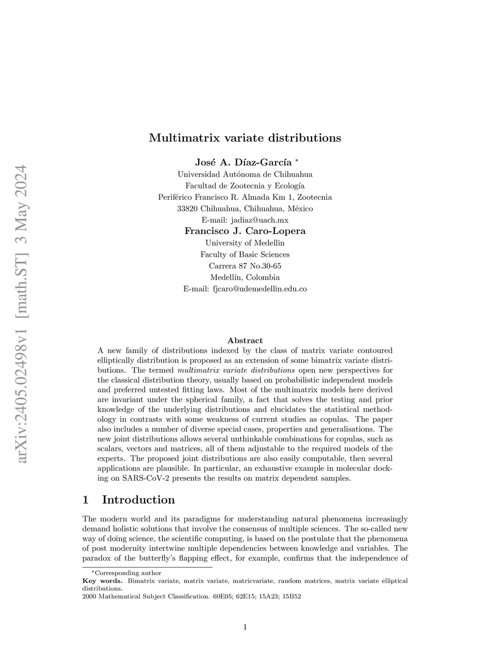 A new family of distributions indexed by the class of matrix variate contoured elliptically distribution is proposed as an extension of some bimatrix variate distributions. The termed \emph{multimatrix variate distributions} open new perspectives for the classical distribution theory, usually based on probabilistic independent models and preferred untested fitting laws. Most of the multimatrix models here derived are invariant under the spherical family, a fact that solves the testing and prior knowledge of the underlying distributions and elucidates the statistical methodology in contrasts with some weakness of current studies as copulas. The paper also includes a number of diverse special cases, properties and generalisations. The new joint distributions allows several unthinkable combinations for copulas, such as scalars, vectors and matrices, all of them adjustable to the required models of the experts. The proposed joint distributions are also easily computable, then several applications are plausible. In particular, an exhaustive example in molecular docking on SARS-CoV-2 presents the results on matrix dependent samples.