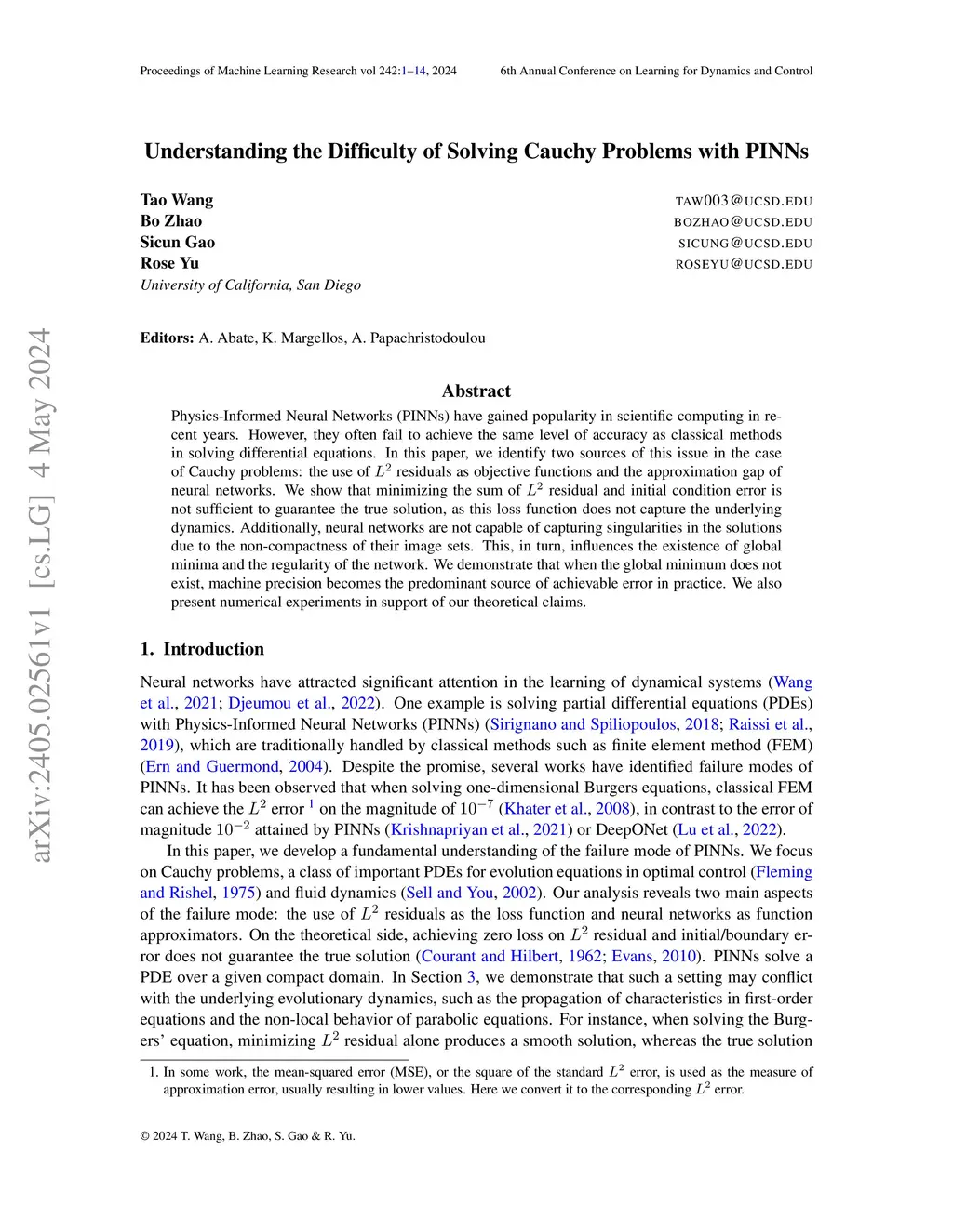 Physics-Informed Neural Networks (PINNs) have gained popularity in scientific computing in recent years. However, they often fail to achieve the same level of accuracy as classical methods in solving differential equations. In this paper, we identify two sources of this issue in the case of Cauchy problems: the use of residuals as objective functions and the approximation gap of neural networks. We show that minimizing the sum of residual and initial condition error is not sufficient to guarantee the true solution, as this loss function does not capture the underlying dynamics. Additionally, neural networks are not capable of capturing singularities in the solutions due to the non-compactness of their image sets. This, in turn, influences the existence of global minima and the regularity of the network. We demonstrate that when the global minimum does not exist, machine precision becomes the predominant source of achievable error in practice. We also present numerical experiments in support of our theoretical claims.