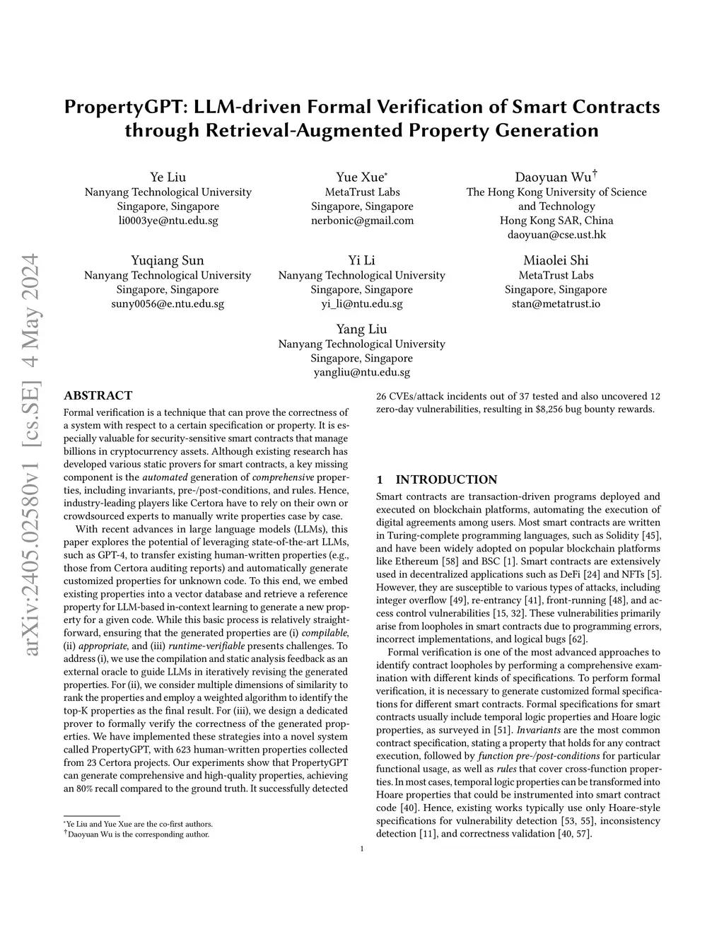 With recent advances in large language models (LLMs), this paper explores the potential of leveraging state-of-the-art LLMs, such as GPT-4, to transfer existing human-written properties (e.g., those from Certora auditing reports) and automatically generate customized properties for unknown code. To this end, we embed existing properties into a vector database and retrieve a reference property for LLM-based in-context learning to generate a new prop- erty for a given code. While this basic process is relatively straight- forward, ensuring that the generated properties are (i) compilable, (ii) appropriate, and (iii) runtime-verifiable presents challenges. To address (i), we use the compilation and static analysis feedback as an external oracle to guide LLMs in iteratively revising the generated properties. For (ii), we consider multiple dimensions of similarity to rank the properties and employ a weighted algorithm to identify the top-K properties as the final result. For (iii), we design a dedicated prover to formally verify the correctness of the generated prop- erties. We have implemented these strategies into a novel system called PropertyGPT, with 623 human-written properties collected from 23 Certora projects. Our experiments show that PropertyGPT can generate comprehensive and high-quality properties, achieving an 80% recall compared to the ground truth. It successfully detected 26 CVEs/attack incidents out of 37 tested and also uncovered 12 zero-day vulnerabilities, resulting in $8,256 bug bounty rewards.