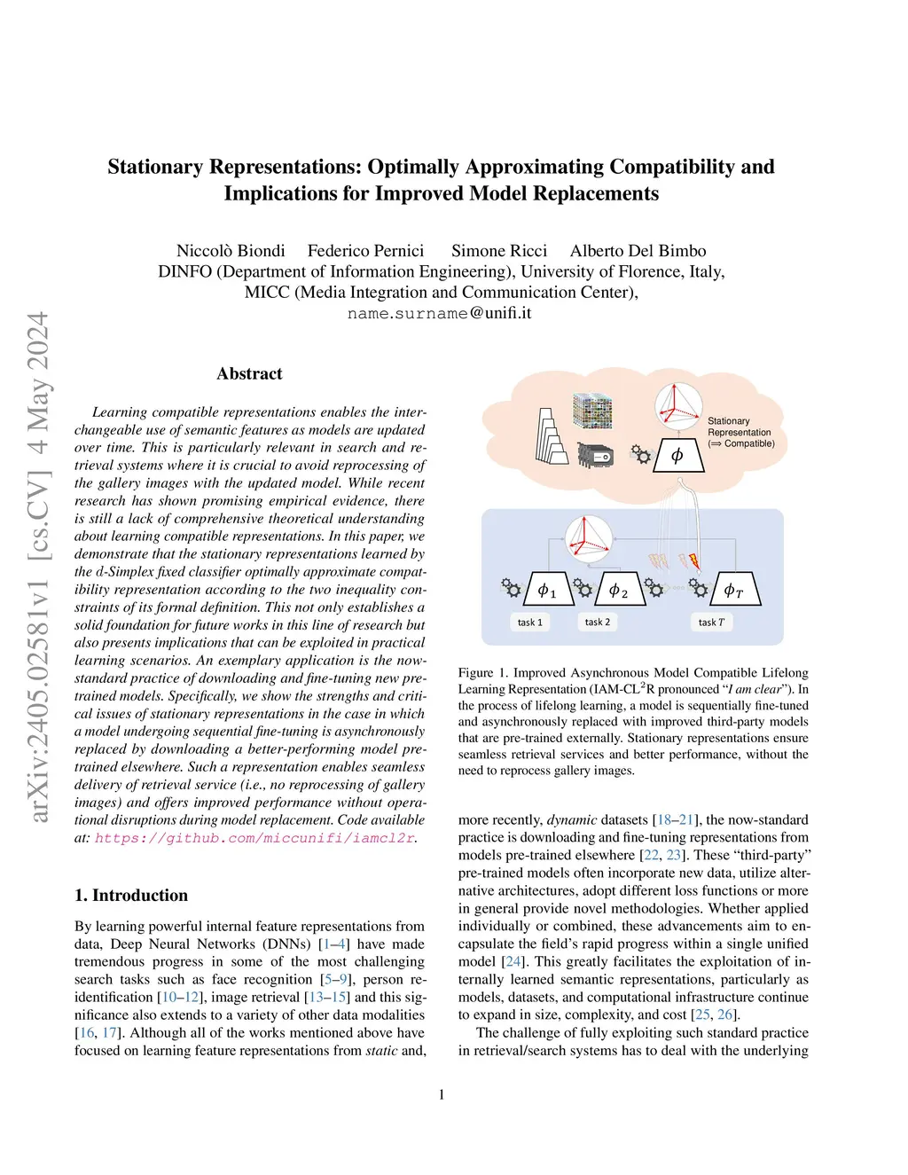 Learning compatible representations enables the interchangeable use of semantic features as models are updated over time. This is particularly relevant in search and retrieval systems where it is crucial to avoid reprocessing of the gallery images with the updated model. While recent research has shown promising empirical evidence, there is still a lack of comprehensive theoretical understanding about learning compatible representations. In this paper, we demonstrate that the stationary representations learned by the -Simplex fixed classifier optimally approximate compatibility representation according to the two inequality constraints of its formal definition. This not only establishes a solid foundation for future works in this line of research but also presents implications that can be exploited in practical learning scenarios. An exemplary application is the now-standard practice of downloading and fine-tuning new pre-trained models. Specifically, we show the strengths and critical issues of stationary representations in the case in which a model undergoing sequential fine-tuning is asynchronously replaced by downloading a better-performing model pre-trained elsewhere. Such a representation enables seamless delivery of retrieval service (i.e., no reprocessing of gallery images) and offers improved performance without operational disruptions during model replacement. Code available at: https://github.com/miccunifi/iamcl2r.