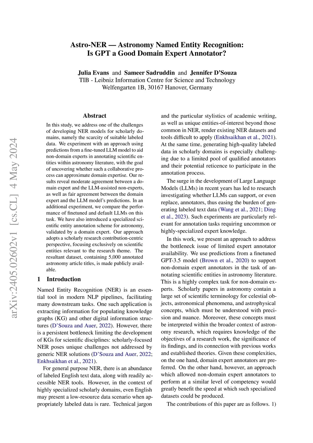 In this study, we address one of the challenges of developing NER models for scholarly domains, namely the scarcity of suitable labeled data. We experiment with an approach using predictions from a fine-tuned LLM model to aid non-domain experts in annotating scientific entities within astronomy literature, with the goal of uncovering whether such a collaborative process can approximate domain expertise. Our results reveal moderate agreement between a domain expert and the LLM-assisted non-experts, as well as fair agreement between the domain expert and the LLM model's predictions. In an additional experiment, we compare the performance of finetuned and default LLMs on this task. We have also introduced a specialized scientific entity annotation scheme for astronomy, validated by a domain expert. Our approach adopts a scholarly research contribution-centric perspective, focusing exclusively on scientific entities relevant to the research theme. The resultant dataset, containing 5,000 annotated astronomy article titles, is made publicly available.