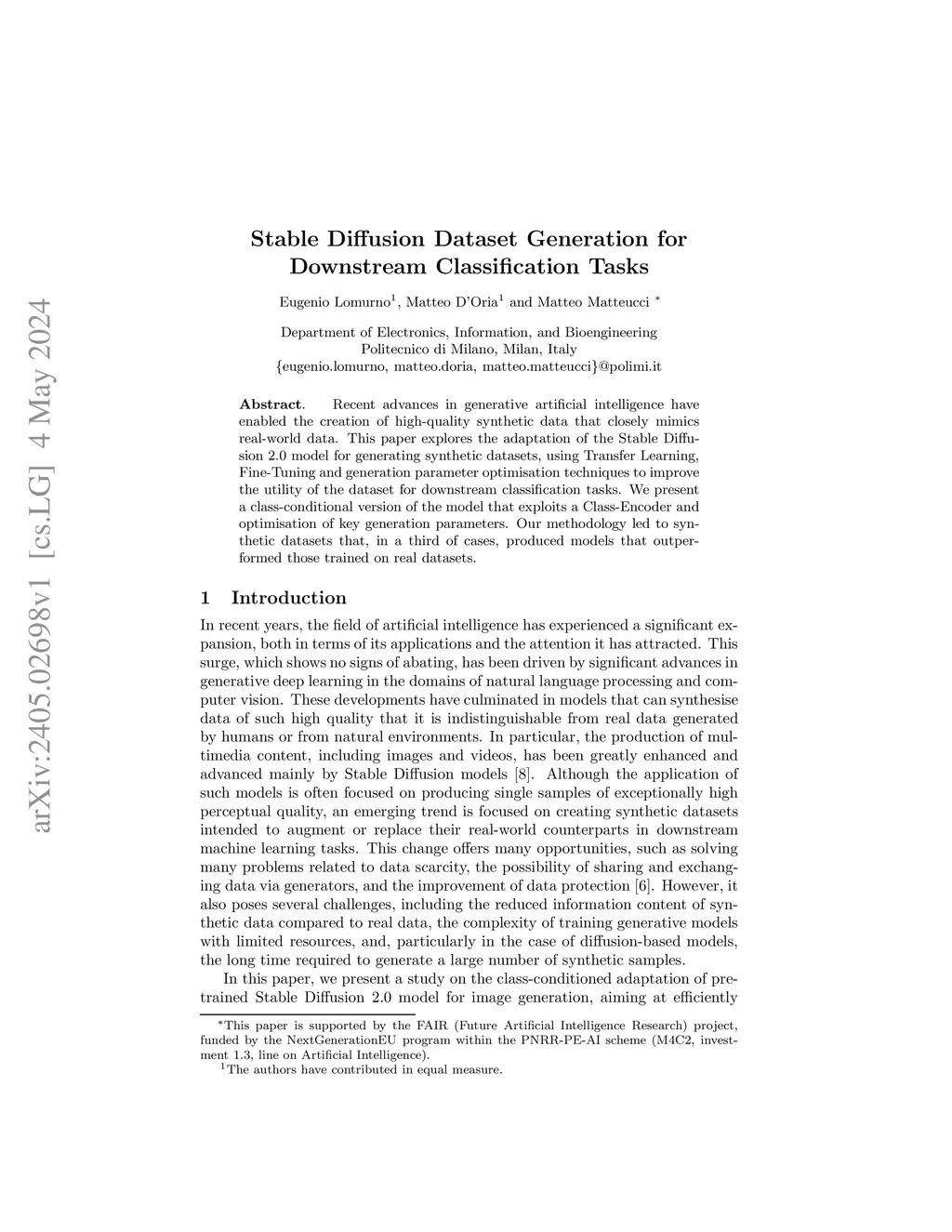 Recent advances in generative artificial intelligence have enabled the creation of high-quality synthetic data that closely mimics real-world data. This paper explores the adaptation of the Stable Diffusion 2.0 model for generating synthetic datasets, using Transfer Learning, Fine-Tuning and generation parameter optimisation techniques to improve the utility of the dataset for downstream classification tasks. We present a class-conditional version of the model that exploits a Class-Encoder and optimisation of key generation parameters. Our methodology led to synthetic datasets that, in a third of cases, produced models that outperformed those trained on real datasets.