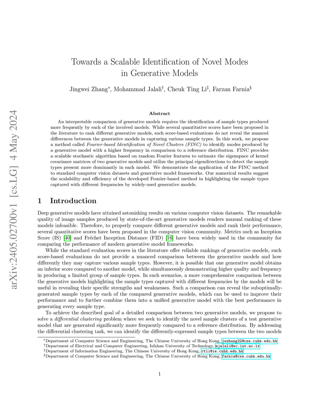 A fine-grained comparison of generative models requires the identification of sample types generated differently by each of the involved models. While quantitative scores have been proposed in the literature to rank different generative models, score-based evaluation and ranking do not reveal the nuanced differences between the generative models in producing different sample types. In this work, we propose solving a differential clustering problem to detect sample types generated differently by two generative models. To solve the differential clustering problem, we develop a spectral method called Fourier-based Identification of Novel Clusters (FINC) to identify modes produced by a generative model with a higher frequency in comparison to a reference distribution. FINC provides a scalable algorithm based on random Fourier features to estimate the eigenspace of kernel covariance matrices of two generative models and utilize the principal eigendirections to detect the sample types present more dominantly in each model. We demonstrate the application of the FINC method to large-scale computer vision datasets and generative modeling frameworks. Our numerical results suggest the scalability of the developed Fourier-based method in highlighting the sample types produced with different frequencies by generative models. The project code is available atthis https URL.