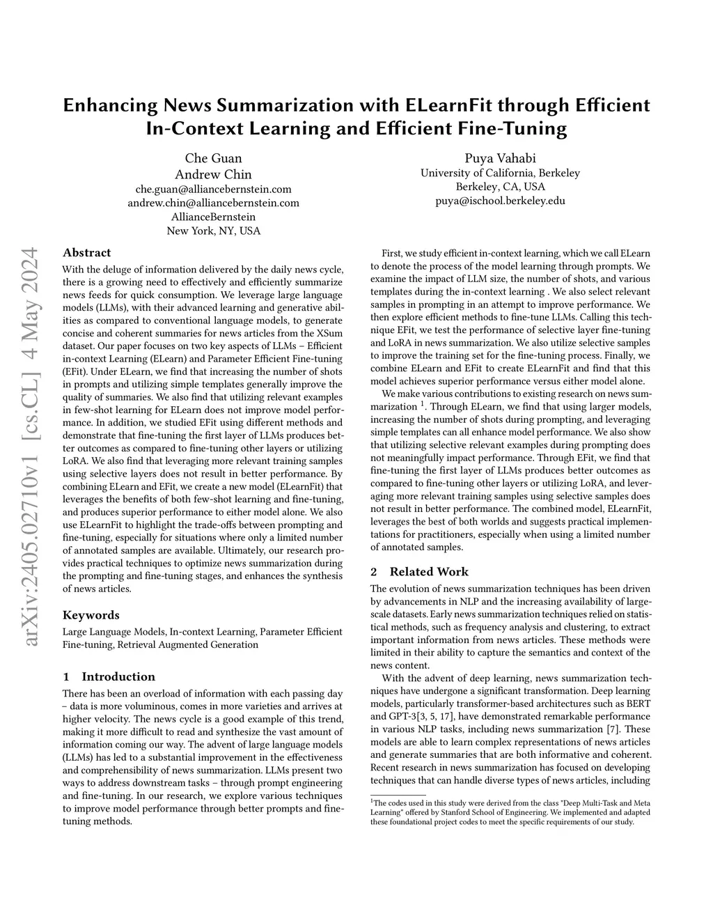 Enhancing News Summarization with ELearnFit through Efficient In-Context