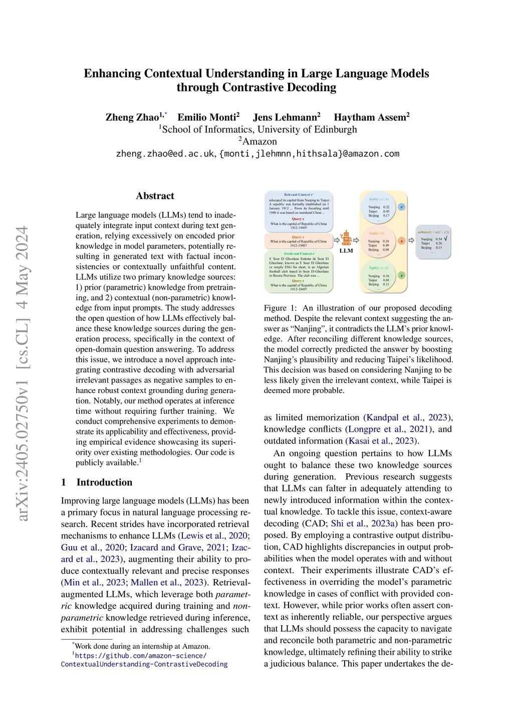 Large language models (LLMs) tend to inadequately integrate input context during text generation, relying excessively on encoded prior knowledge in model parameters, potentially resulting in generated text with factual inconsistencies or contextually unfaithful content. LLMs utilize two primary knowledge sources: 1) prior (parametric) knowledge from pretraining, and 2) contextual (non-parametric) knowledge from input prompts. The study addresses the open question of how LLMs effectively balance these knowledge sources during the generation process, specifically in the context of open-domain question answering. To address this issue, we introduce a novel approach integrating contrastive decoding with adversarial irrelevant passages as negative samples to enhance robust context grounding during generation. Notably, our method operates at inference time without requiring further training. We conduct comprehensive experiments to demonstrate its applicability and effectiveness, providing empirical evidence showcasing its superiority over existing methodologies. Our code is publicly available at: https://github.com/amazon-science/ContextualUnderstanding-ContrastiveDecoding.