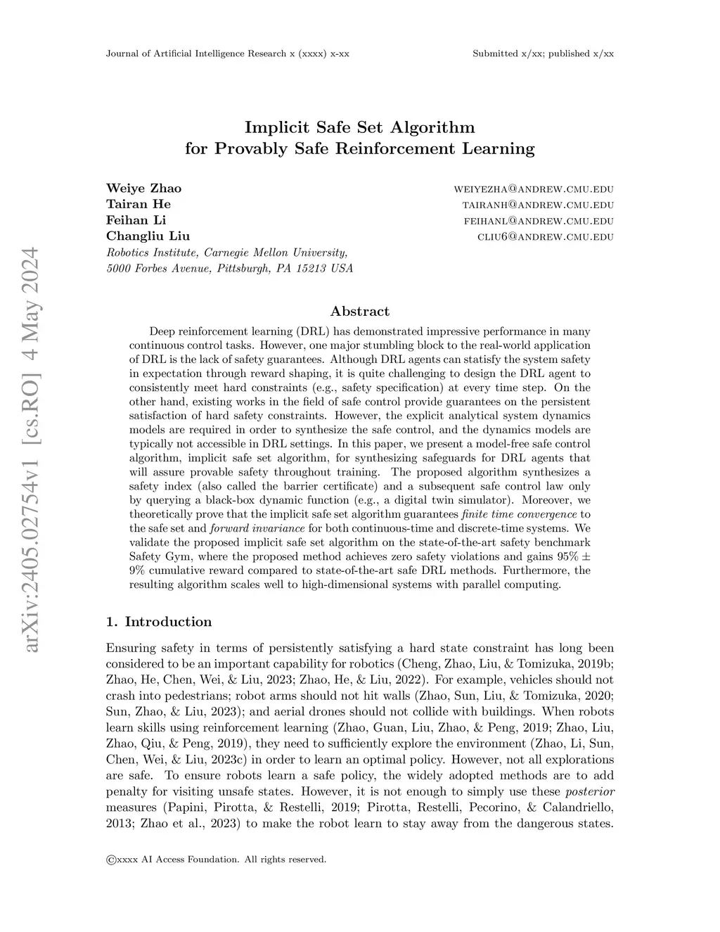 Implicit Safe Set Algorithm for Provably Safe Reinforcement Learning
