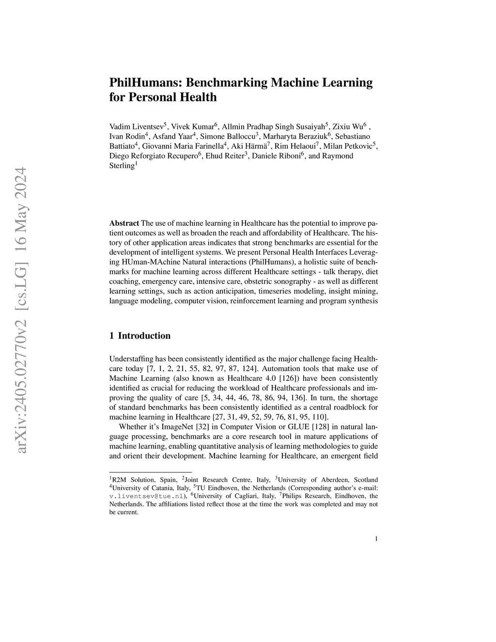 The use of machine learning in Healthcare has the potential to improve patient outcomes as well as broaden the reach and affordability of Healthcare. The history of other application areas indicates that strong benchmarks are essential for the development of intelligent systems. We present Personal Health Interfaces Leveraging HUman-MAchine Natural interactions (PhilHumans), a holistic suite of benchmarks for machine learning across different Healthcare settings - talk therapy, diet coaching, emergency care, intensive care, obstetric sonography - as well as different learning settings, such as action anticipation, timeseries modeling, insight mining, language modeling, computer vision, reinforcement learning and program synthesis